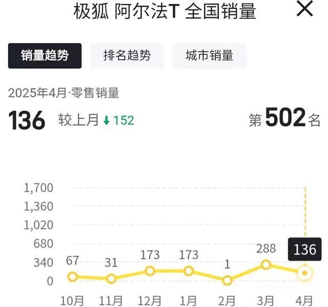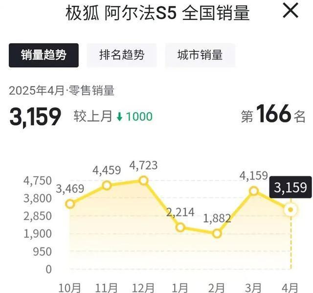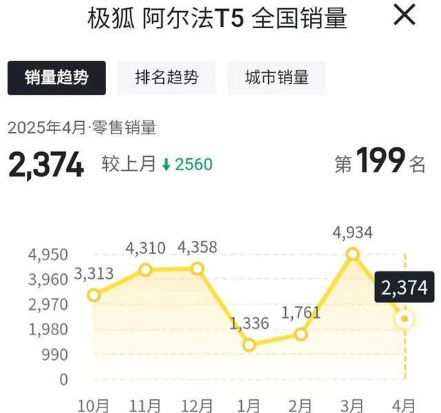 4月销量一出,直接傻眼。3月份还能卖13018辆,4月直接腰斩,只剩下7500辆,环比暴跌42.38%!更扎心的是,全系车型无一幸免,阿尔法S5、T5、考拉,甚至连阿尔法T和S都没能逃脱销量下滑的命运。这究竟是咋回事?