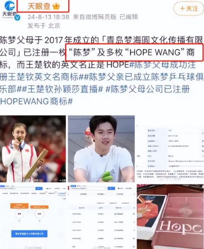 还有人说陈梦母亲专门为“女婿”王楚钦注册了“HOPEWANG”商标。