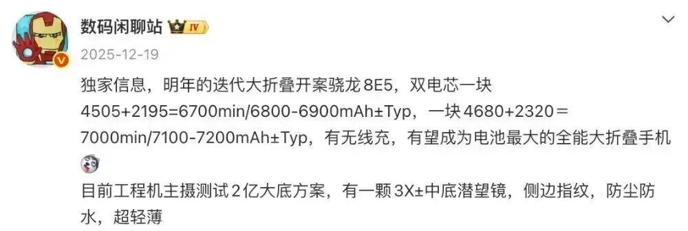 同一位博主以往的消息还曾提到过,“迭代大折叠开案骁龙8E5,双电芯一块4505+2195=6700min/6800-6900mAh±Typ,一块4680+2320=7000min/7100-7200mAh±Typ,有无线充,有望成为电池最大的全能大折叠手机。目前工程机主摄测试2亿大底方案,有一颗3X±中底潜望镜,侧边指纹,防尘防水,超轻薄”。