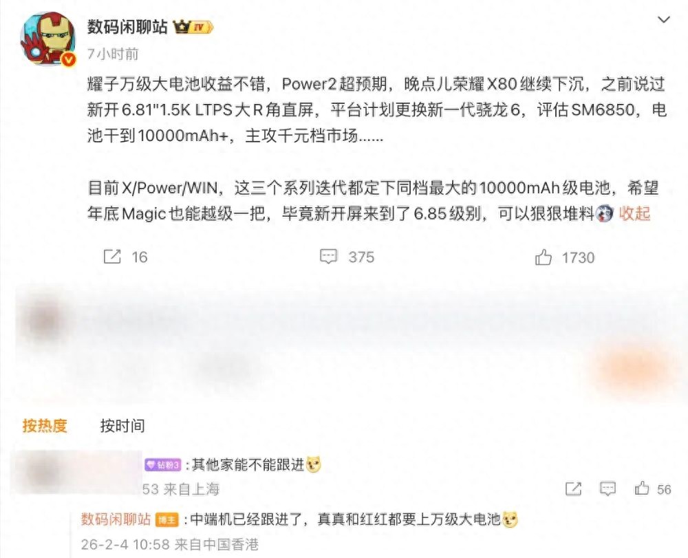 另外还有爆料提到过,“耀子电池策略太激进了,X80新机也是10000mAh+大电池,新开6.81"1.5K LTPS大R角直屏,骁龙低功耗处理器,定位千元档。至于性能机,26年底「可能」才有其它家上巨容量10000mAh±,在此之前,竞品最大电池是9开头”。
