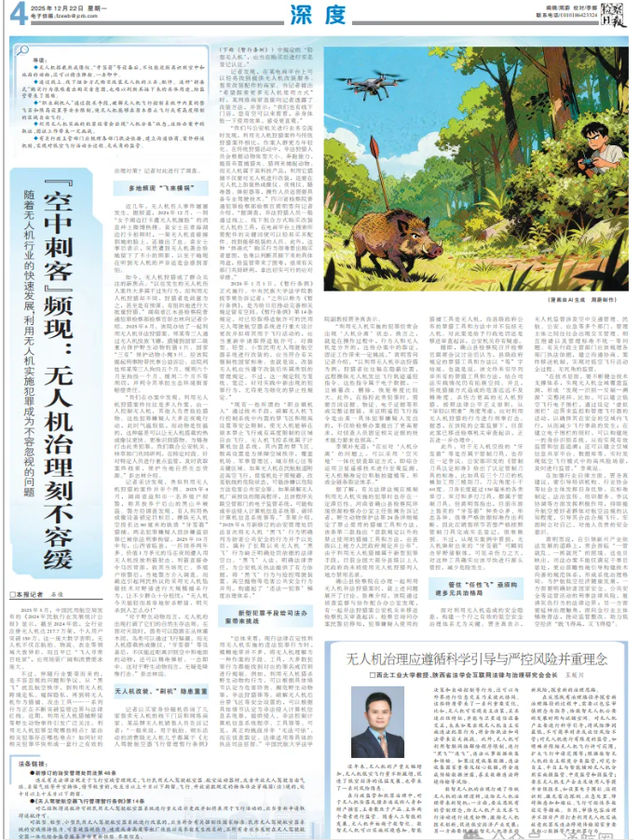 《检察日报》刊发的深度报道《“空中刺客”频现:无人机治理刻不容缓》,明确指出了当前低空领域面临的法治监管短板。随着无人机技术的快速发展,部分不法分子将其作为犯罪工具,实施非法狩猎、跨境走私、侵犯公民个人信息等违法犯罪行为,新型犯罪风险对低空领域安全构成严重威胁。这一技术滥用现象对司法办案工作提出了全新挑战,其中取证固证环节的诸多难题亟待破解,成为推进低空领域法治治理必须解决的重要问题。