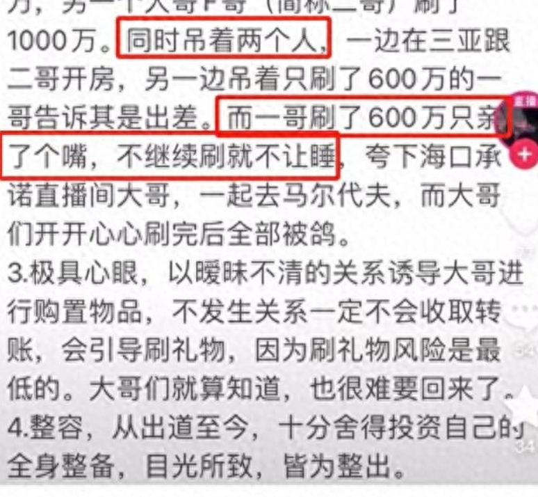 在这里就不得不提前段时间,千万网红王霖被公司下属爆料这件事情,据这位总监爆料,像王霖这种千万网红,也是依靠做爱情买卖发家。甚至在有男朋友的情况下,依旧与榜一大哥见面,而与王霖见面的代价比起这位小主播,可谓是一个天上,一个地下。