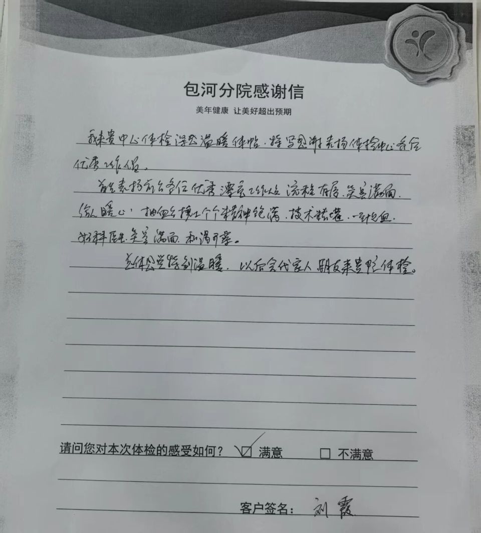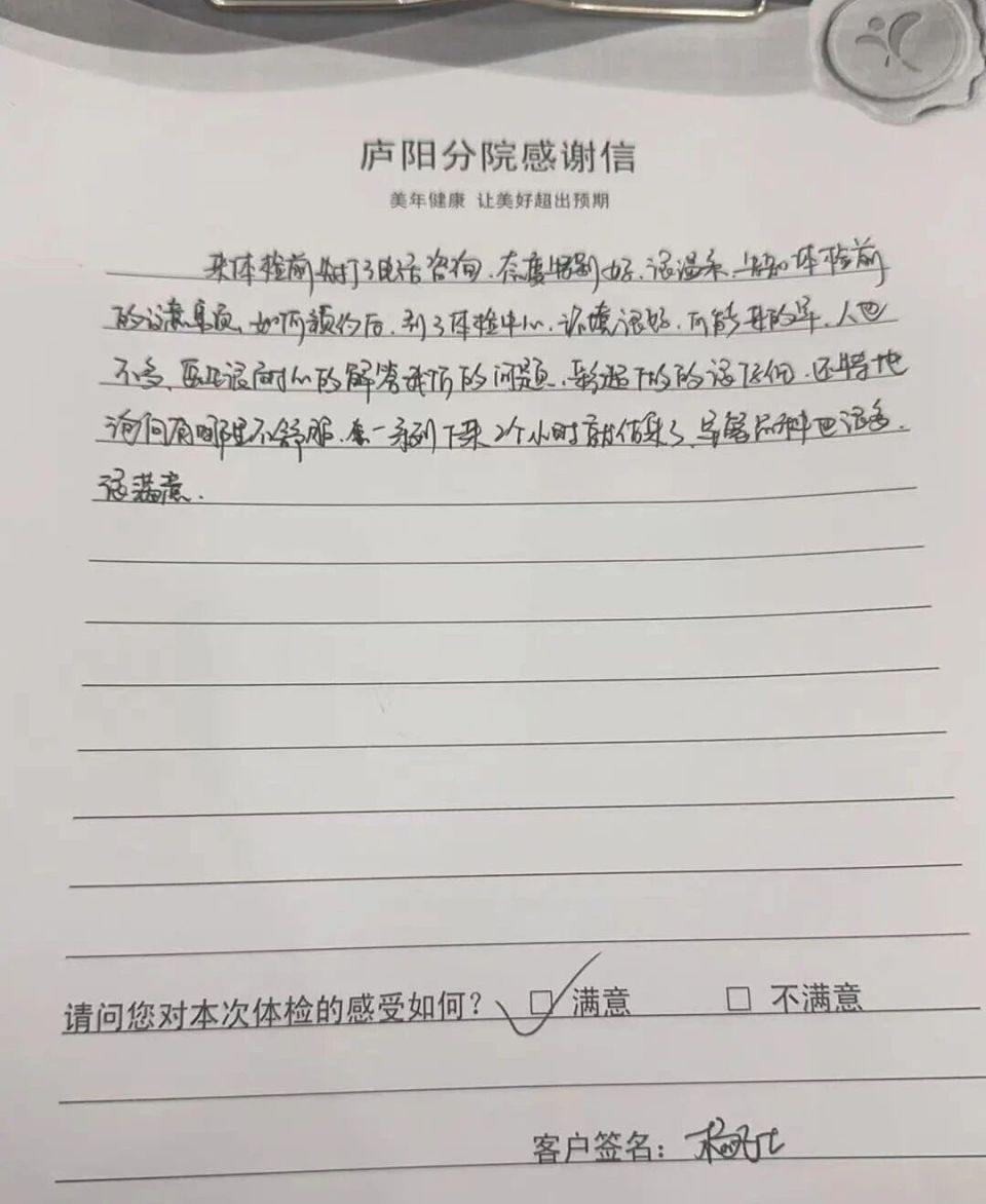 包河分院的刘女士,特意写下感谢信表扬全体工作人员,字里行间满是暖意:“前台姑娘们笑容满面、流程有序,抽血护士技术精湛、一针见血,妇科医生和蔼可亲,总体感觉特别温暖。”