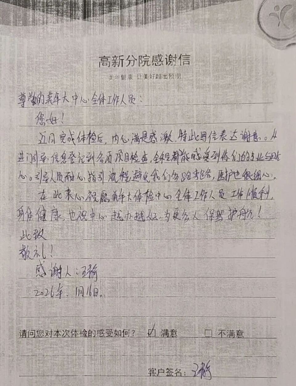 来自高新分院的王女士,在信中满是感激地写道:“从进门引导,信息登记到各项检查,全程都能感受到你们的专业与贴心。”这正是高新分院服务的日常写照——导检人员始终穿梭在各个科室之间,主动询问客户需求,耐心指引体检流程,用细致的服务帮客户省去多跑冤枉路的困扰,让每一位客户都能在有序高效中完成体检。
