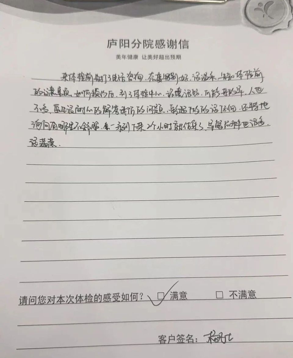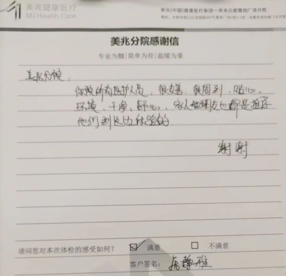 每一封感谢信,都是一份沉甸甸的信任;每一次认可,都是我们精进服务的动力。合肥美年大健康始终以专业的医疗、贴心的服务,守护每一位市民的健康,也用实际行动回应每一位合肥市民对“人少、价优、服务好”体检的期待。
