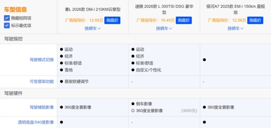 乘坐舒适性上,三款车均能满足基础长途需求,但秦L DM-i与银河A7的轴距长,乘坐空间、储物空间更大,秦L DM-i配备的云辇-C智能阻尼车身控制系统,更是同级领先的黑科技,能有效过滤路面颠簸,长途乘坐疲劳感更低。