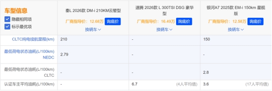 续航方面,秦L DM-i满油满电综合续航2110公里,银河A7综合续航也达到2100公里,二者均为“长途王者”,不过网上很多真实用户反馈,秦L DM-i的实际续航达成率更高;速腾L满油续航仅700-800公里,长途需频繁进服务区加油,春节高峰期易遭遇排队,影响出行效率。