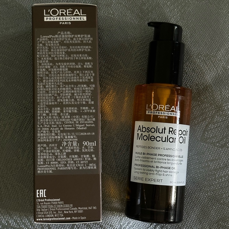 欧莱雅pro护发精油,1907年在法国成立,最初是家染发产品研发公司,后来慢慢扩展到美发护理领域,目前产品主要涉及染发、造型和日常护理这几块,包装设计一贯走 salon 专业线风格,瓶身偏冷色调金属感居多,研发背景跟理发店合作挺密切的。