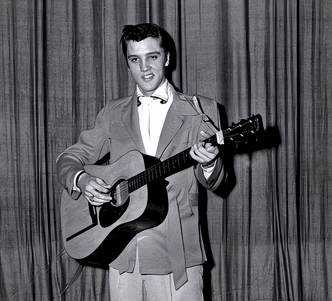 他的风格混摇滚、蓝调和乡村,舞台上髋部扭得狂野,粉丝尖叫不停。1955年转RCA唱片,出《Heartbreak Hotel》,卖超百万,登公告牌榜首。1956年上电视节目《米尔顿·伯尔秀》,动作大胆,全国争议四起。