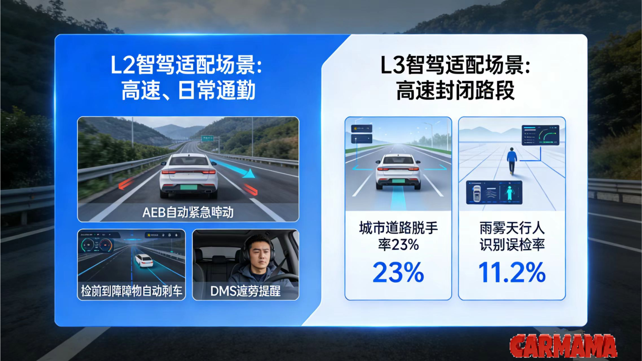 CARMAMA提醒,现有车主别盲目升级L3功能,优先用好L2的基础安全配置;潜在购车者可优先选搭载毫米波雷达+视觉融合方案的车型,稳定性更优。