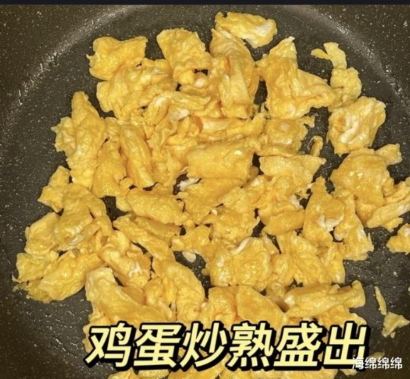 接下来,炒鸡蛋。锅中倒入适量的油,油热后倒入蛋液,用中火快速翻炒。炒至鸡蛋凝固,呈金黄色块状时,盛出备用。这一步要注意火候,火太大容易炒老,火太小则炒不出蓬松的口感。炒好的鸡蛋要盛出,避免后续翻炒时变老。