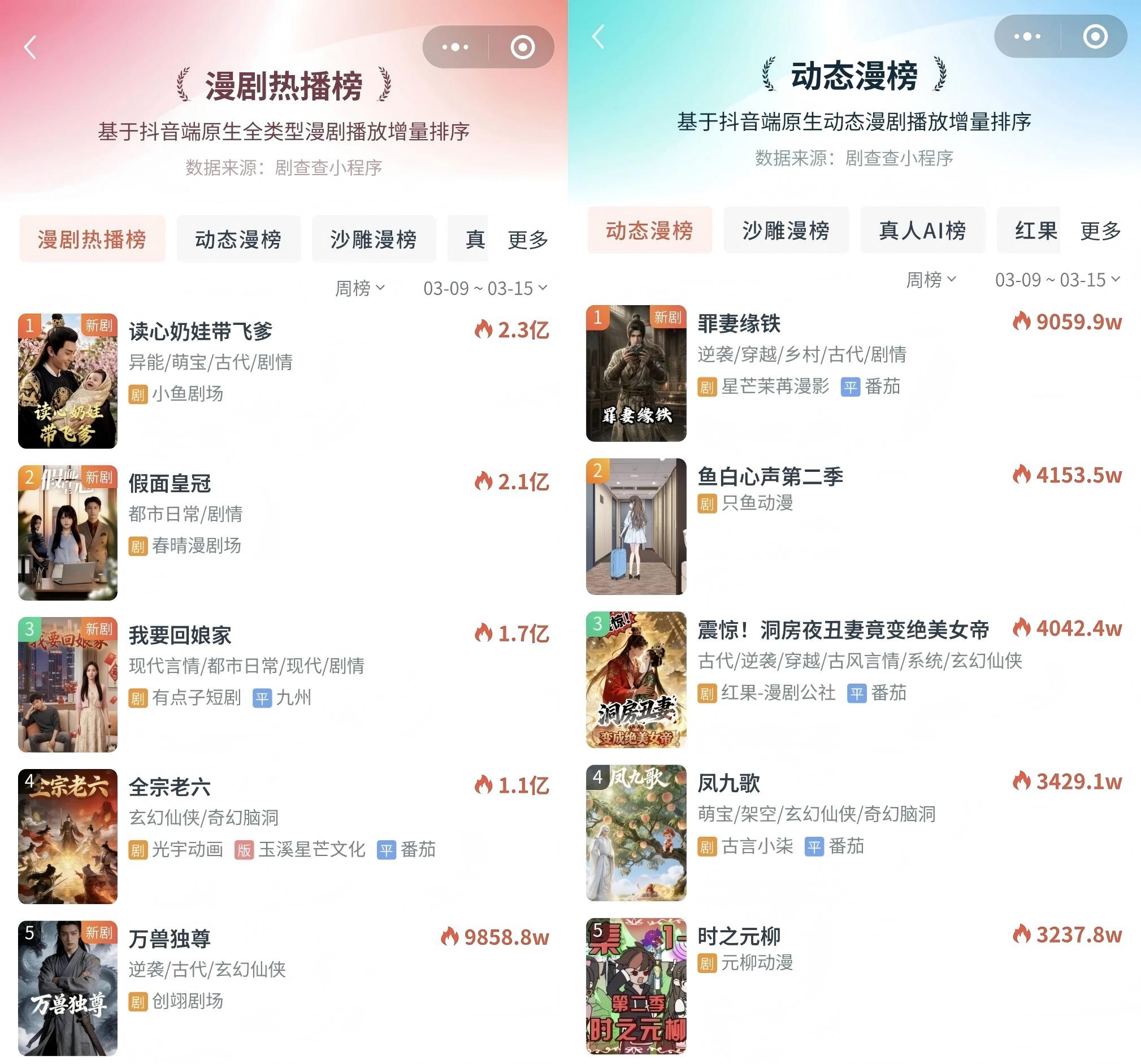 上周(2026年3月9日-3月15日),抖音端AI漫剧相关新剧有9611部,比前一周多差不多一半。