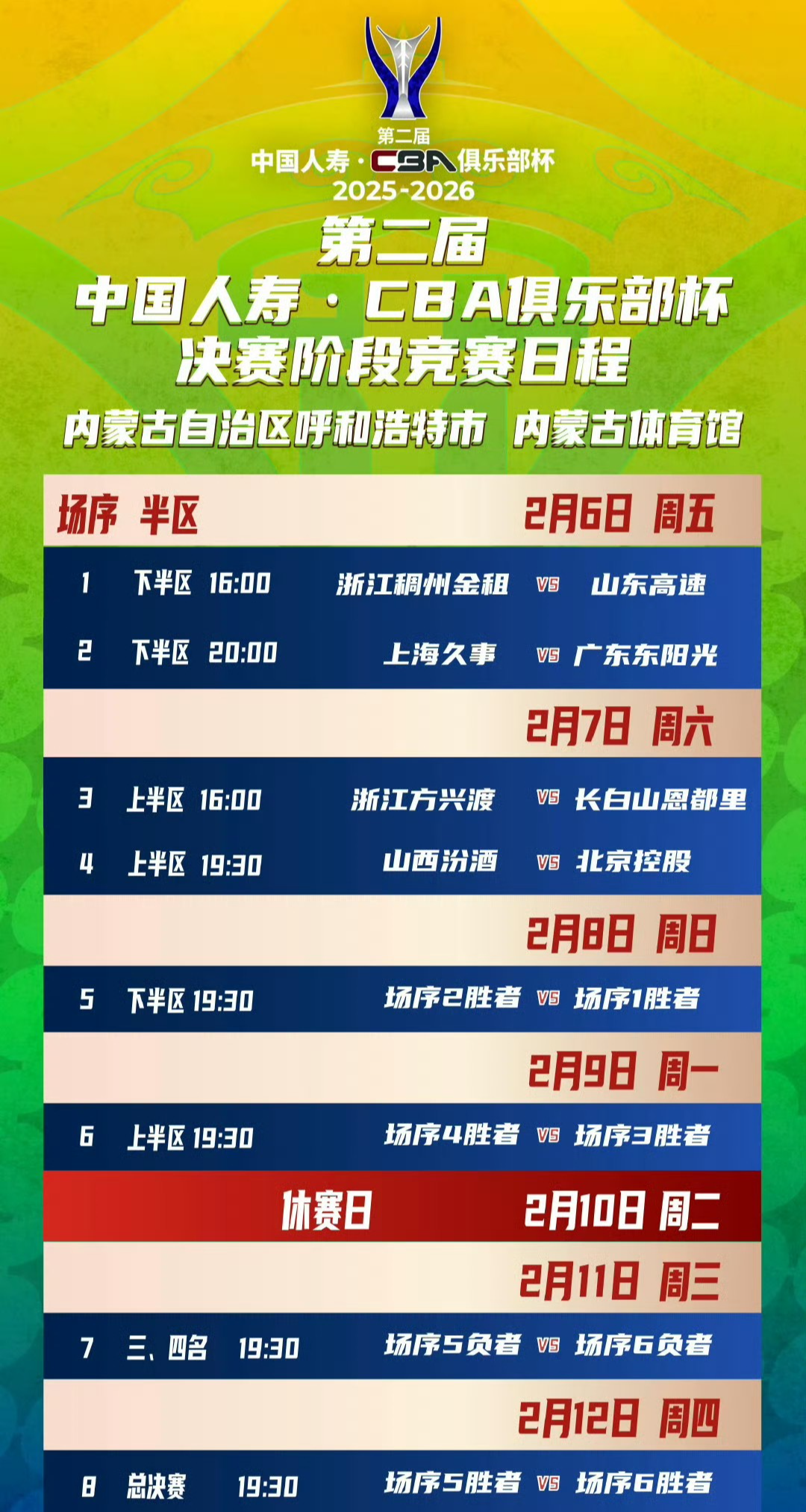 2月6日-12日,CBA俱乐部杯决赛,将在内蒙古呼和浩特举行,八支球队争夺冠军。具体对阵情况如下:上半区:浙江广厦vs吉林男篮、山西男篮vs北控男篮。下半区:上海男篮vs广东男篮、浙江稠州vs山东男篮,具体对阵时间见上方截图。另外,这一次俱乐部杯的比赛,央视体育、咪咕视频和抖音都会全程直播。