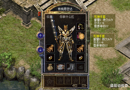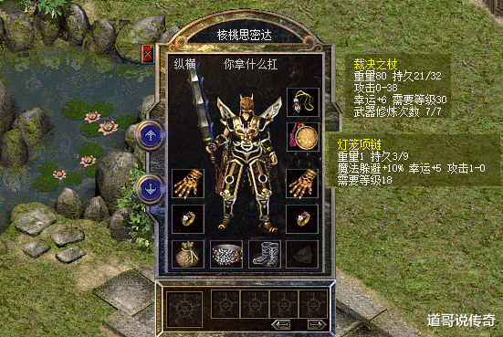 新百区那把攻38运8裁决之杖神出鬼没,持有者不是商人就是巅峰战士。毕竟全区就那么一把,确实不好见到。对比之下老百区的高攻裁决就很多了,攻37的随处可见,但是想要看跳点的依然很难,攻39的就一把,攻38的屈指可数。今天老道就为大家分享老百区的一套战士穿搭:攻38裁决,运5灯笼,攻6死神,这一身不得100万打底?