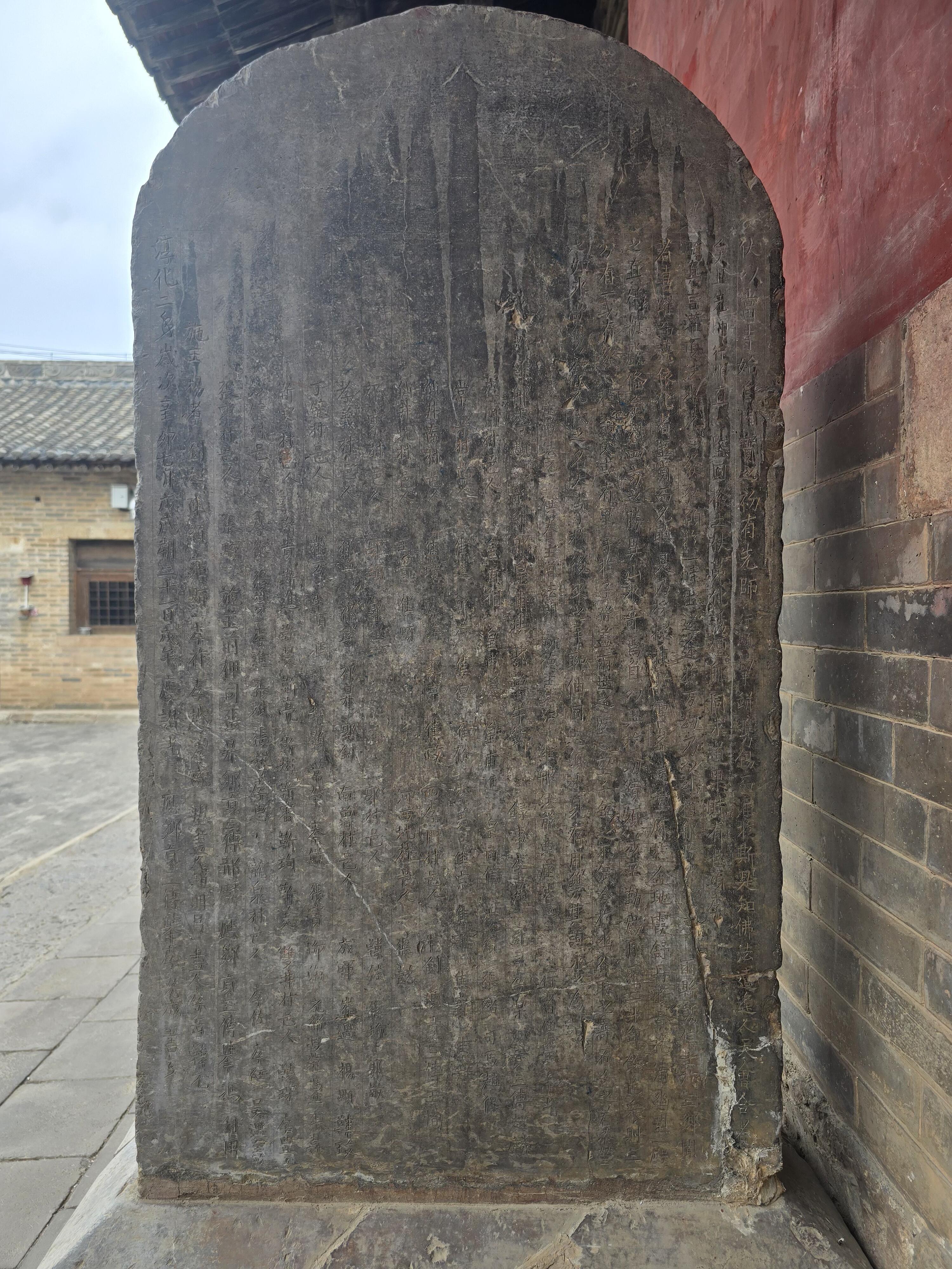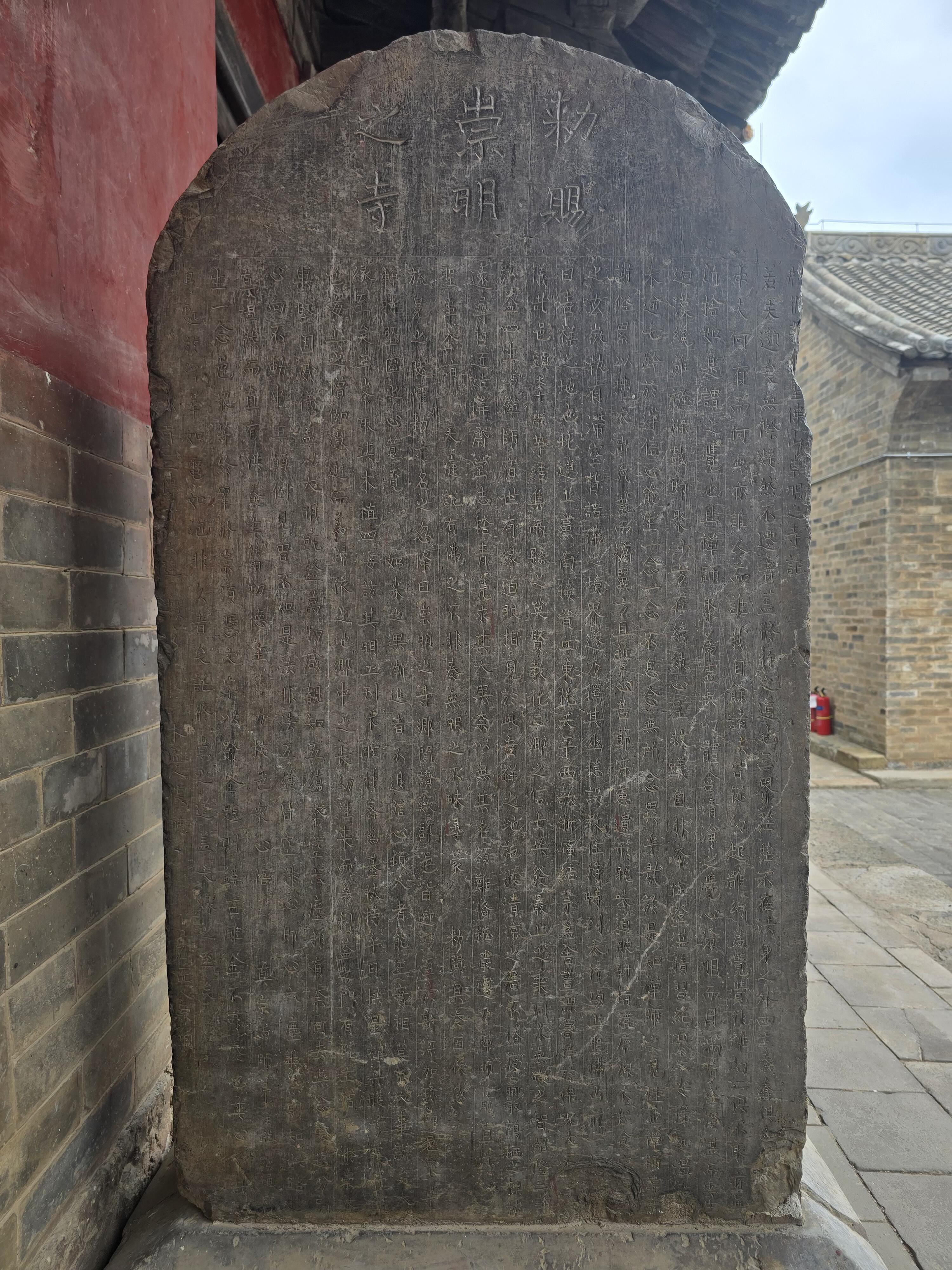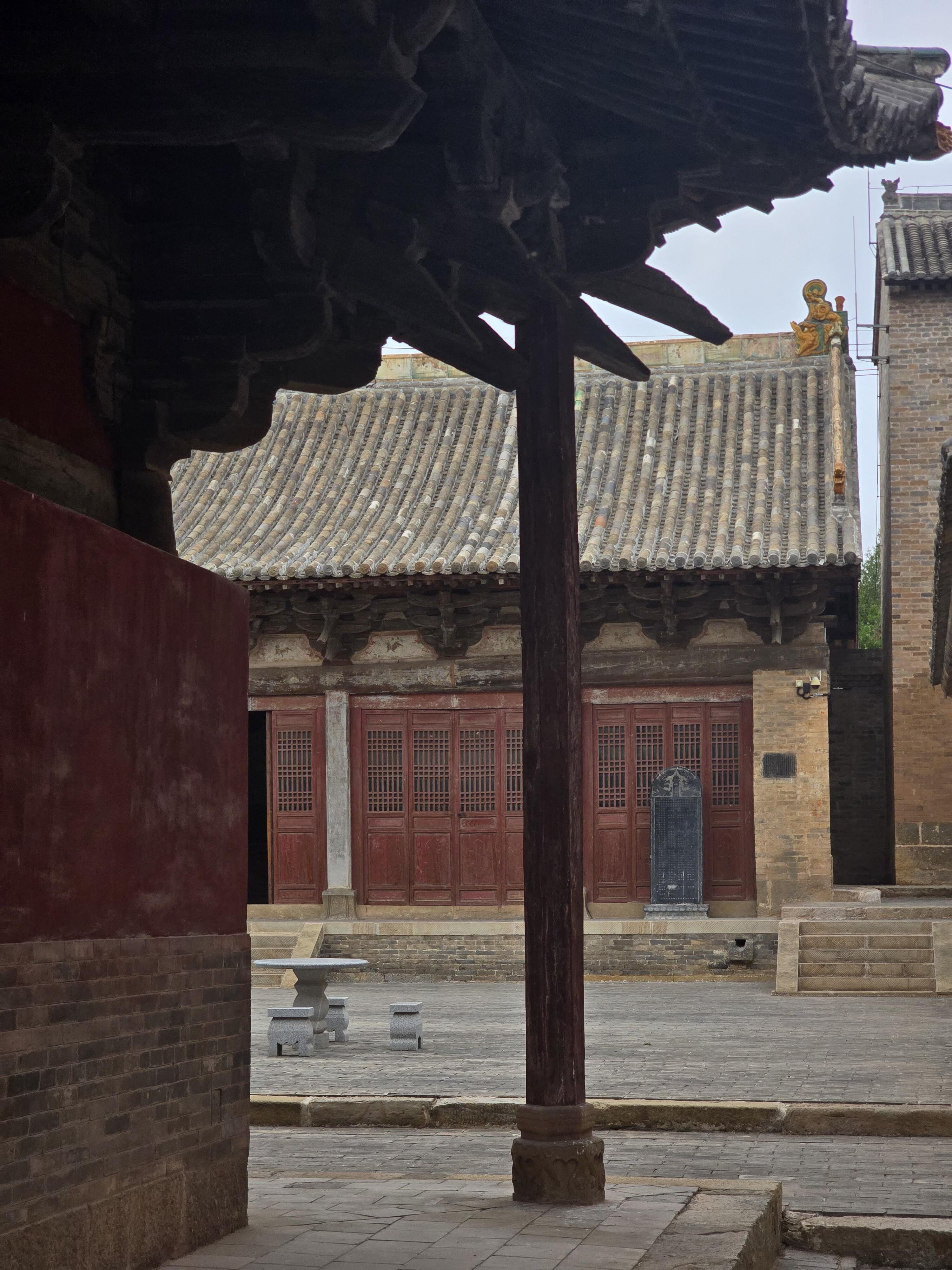 除了中佛殿,崇明寺里还有几座值得一看的建筑。后殿是元代建的,明代又修过,面宽五间,单檐悬山顶,虽然没有中佛殿那么惊艳,但屋顶的曲线很柔和,檐下的斗拱也保留了元代的简洁风格,跟中佛殿的繁复形成了鲜明对比。两侧的配殿也是元代遗构,不过清代的时候被改成了硬山顶,从侧面看还能隐约看到元代时的建筑痕迹。寺里还有几块老碑,最珍贵的是北宋淳化二年(991年)的《创建救赐圣佛山崇明寺记》碑,碑上的字虽然有些模糊,但还能看清“开宝四年建殿”的记载,这也成了中佛殿建造年代的最直接证据。