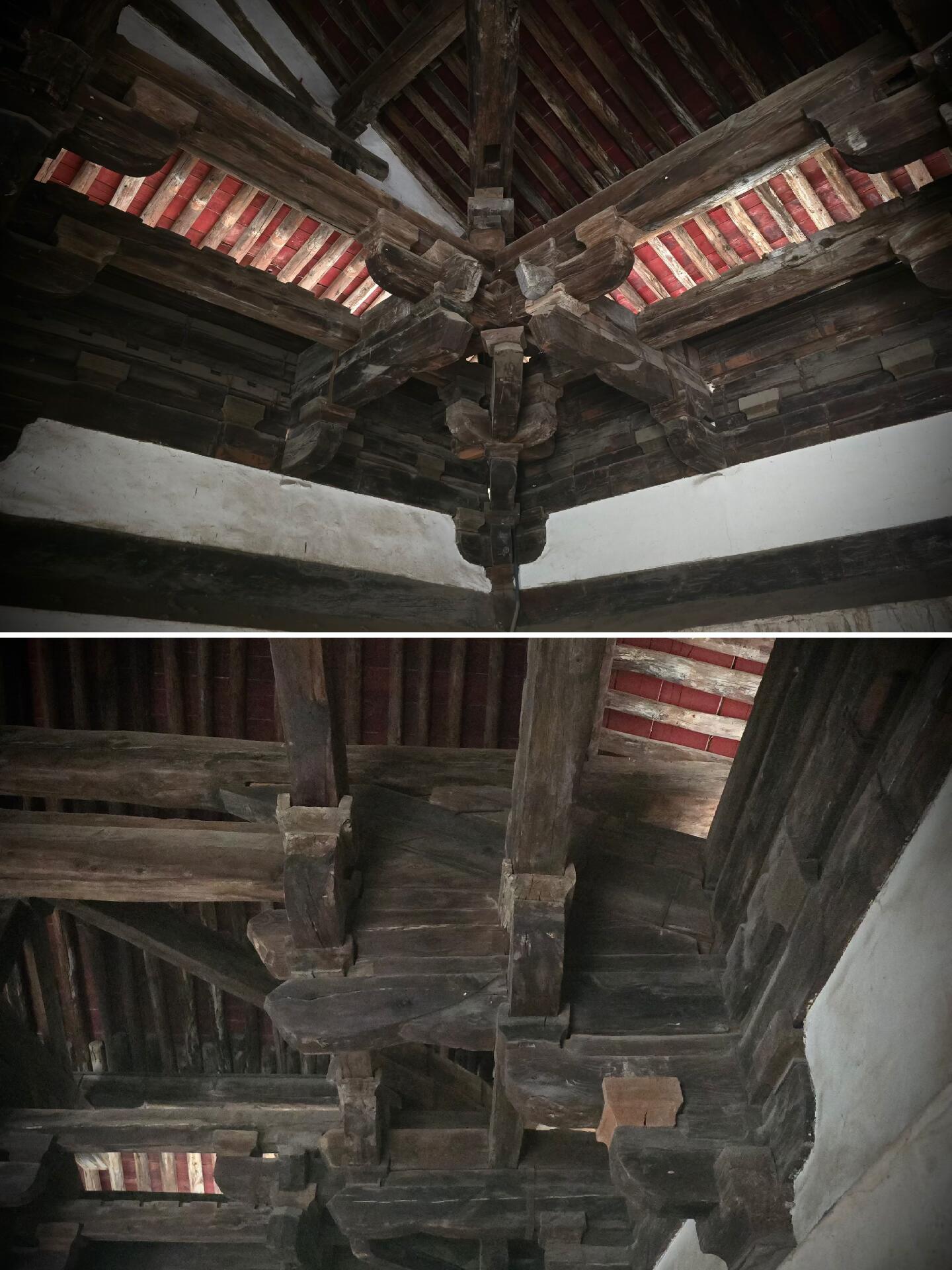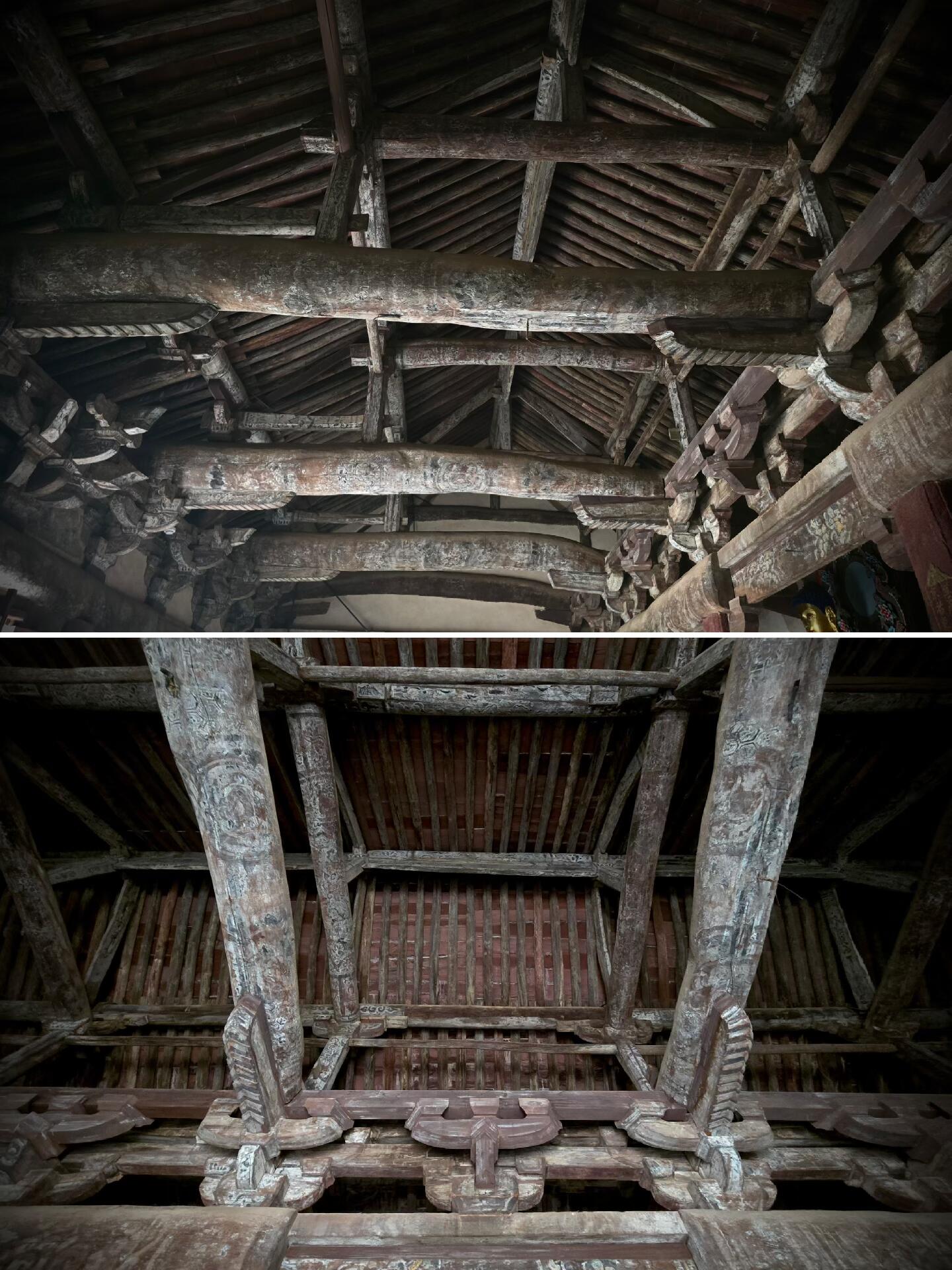 不过中佛殿最让人拍案叫绝的,还得是殿内的“断梁”结构。一般的大殿用的都是整根大梁,越长越粗越显得气派,可中佛殿偏偏反其道而行之,用两根短梁对接成了一根“断梁”,中间还加了根顺栿串承重。第一次听说这结构时,我还不信,特意绕到殿内抬头找,果然看见那根“断梁”就架在梁架中间,两根短梁的接口处被顺栿串牢牢锁住,顺栿串又把重量传到两侧的檐柱上,整个受力逻辑清晰得像一道力学题。可北宋的时候没有电脑计算,工匠全靠经验和手感,就想出了这么个“以短代长”的办法,既解决了当时找不到足够长的木料的难题,又保证了建筑的稳固性——要知道这座殿已经站了一千多年,经历过地震、风雨,梁架却连一点变形都没有,这种智慧放在现在也足够让人惊叹。