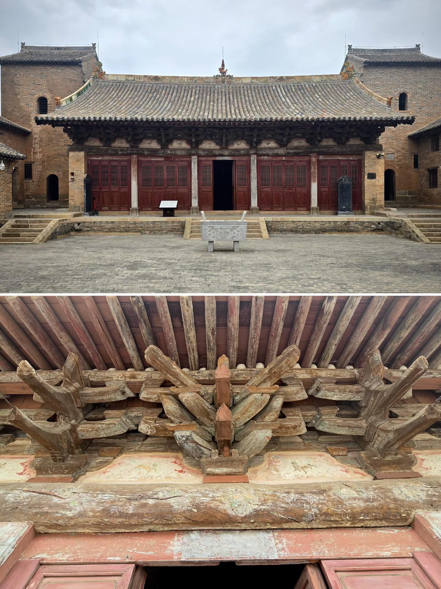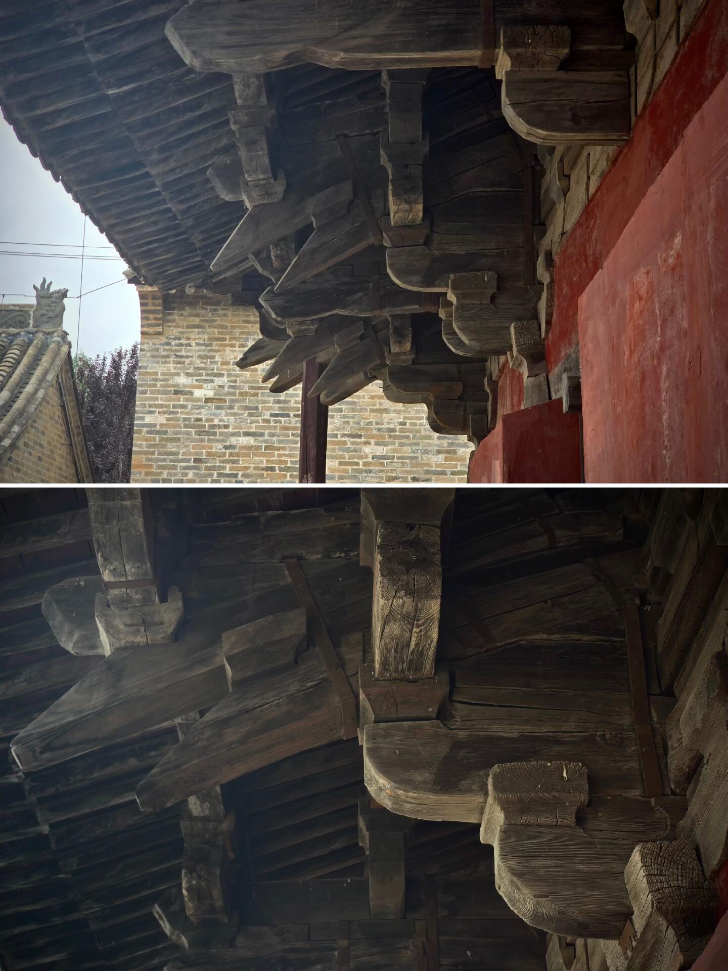 还有人说,崇明寺殿里没有塑像,少了点“人气”,可我觉得恰恰相反——没有塑像的干扰,才能更专注地欣赏建筑本身:看斗拱的榫卯如何咬合,看“断梁”如何承重,看梁架的木纹如何在时光里沉淀。尤其是在微雨的中午,寺里静得能听见自己的脚步声,雨水顺着檐角滴下来,打在青石板上发出“滴答”的声音,那一刻仿佛能跟北宋的工匠对话,能想象出他们当年建造这座大殿时的场景:有人在凿木头,有人在搭斗拱,有人在测量尺寸,忙忙碌碌,却有条不紊。