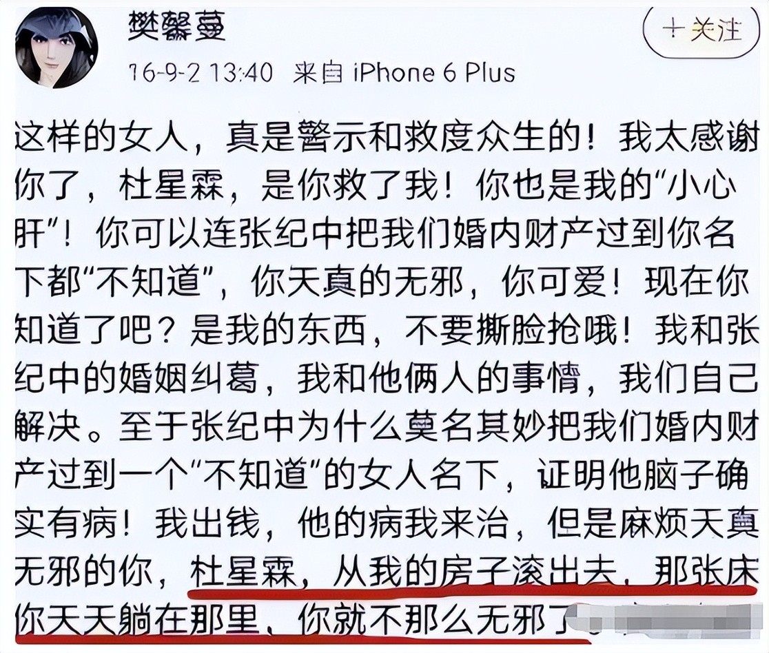 为了逼樊馨蔓离婚,他还倒打一耙泼脏水。最后樊馨蔓忍无可忍,直接甩出实锤,把张纪中“贪财好色”的真面目晾在了太阳底下。