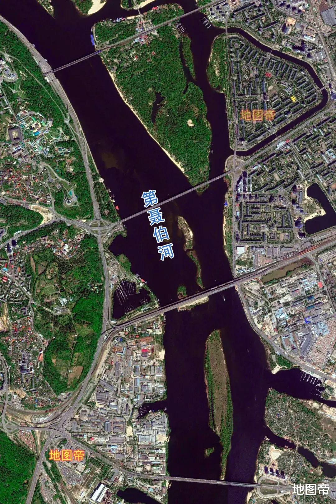 第聂伯河分成两个部分:乌克兰首都基辅以北,称为上第聂伯河;基辅以南至入海口,称为下第聂伯河。下第聂伯河像一条彩带,把面积60万平方千米的乌克兰,大致分为西乌和东乌两个部分。