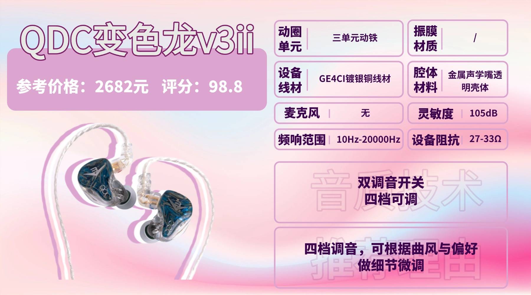 变 色龙 V 3II 提供公模与定制两种版本,我体验的是通用腔体款。整体隔音能力比较稳定,上耳适配性友好,大多数耳型都能一次戴稳。三动铁架构下,声音走的是偏清爽、偏利落的方向,解析取向明显,线条感清晰。声场展开在同级里属于比较开阔的一档,听器乐或节奏鲜明的曲目时,层次感和速度感都比较突出。不过中频厚度相对收敛,人声并不走浓郁路线,如果更偏好温暖、靠前的人声,可能需要通过更换耳套或前端进行补足。