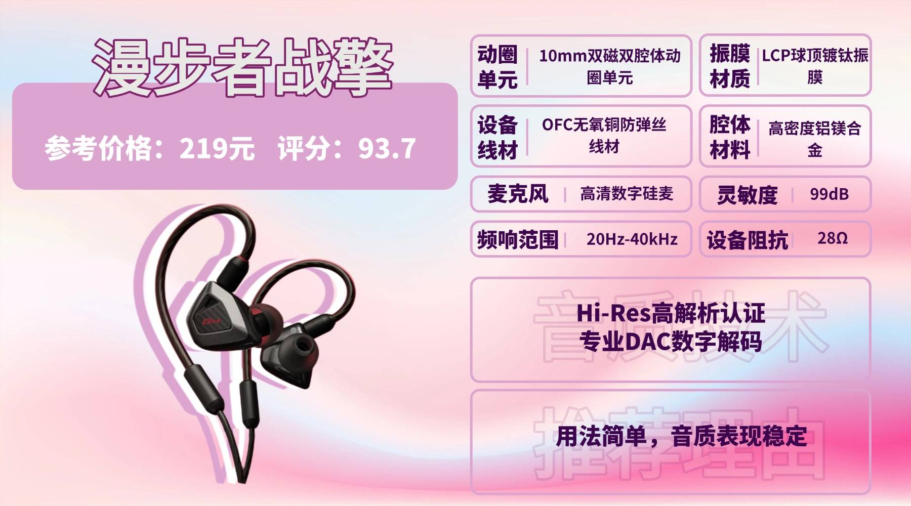 战 擎搭载 10mm 双磁双腔动圈单元,配合 LCP 球顶镀钛振膜,整体声音走的是均衡稳妥路线。解析能力在百元档中属于扎实型,信息量不夸张,但层次关系清楚。低频量感控制得比较克制,听流行、人声或影视配乐时氛围感到位;面对编制较复杂的曲目,瞬态速度略显保守,冲击力不算突出,但胜在不乱。