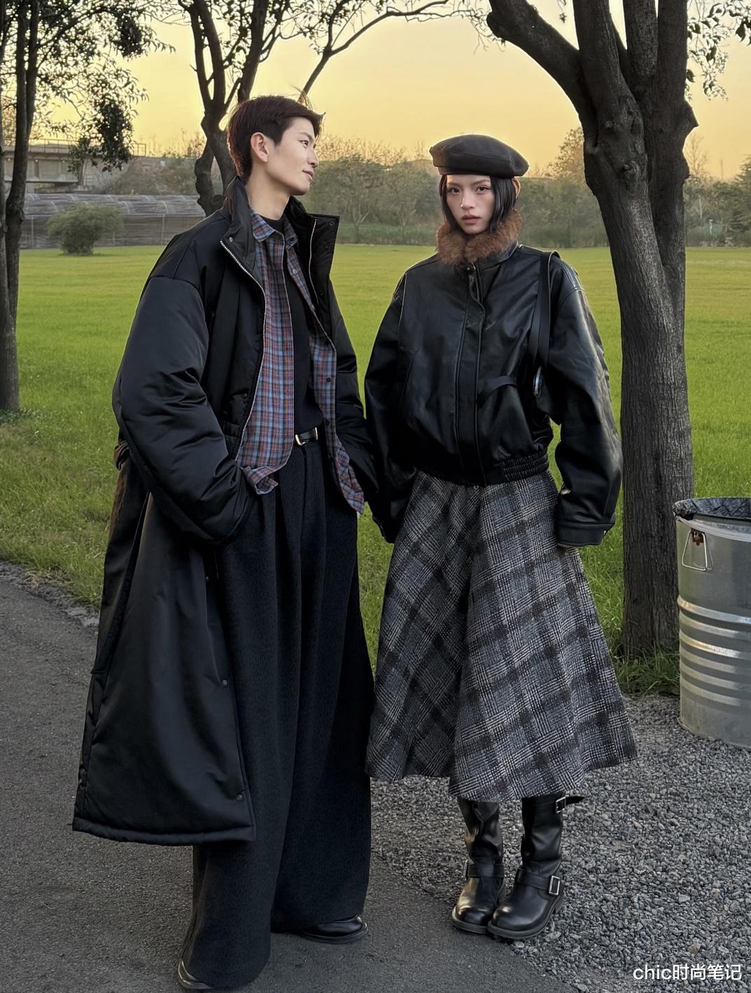 黑色系穿搭是最经典也是最容易穿出高级感,男生的黑色风衣搭配格纹衬衫,和女生的格纹半身长裙存在共同元素,配上女生的机车服,两套超完美的情侣穿搭get。