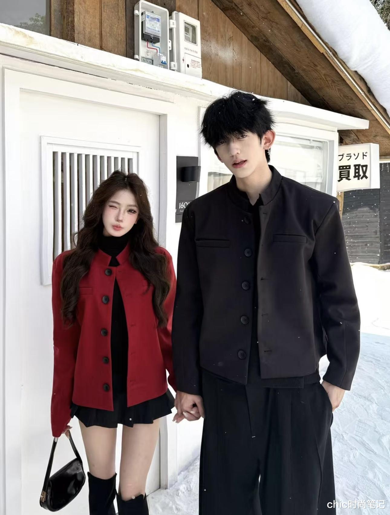 女生选择红色外套搭配黑色短裙,男生则选择同面料但不同颜色的外套与之搭配,黑色外套自带帅气,搭配黑色休闲裤后把时尚度拉满。