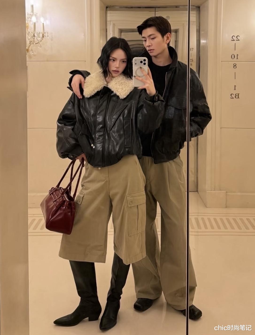男生、女生都选择机车皮衣作为穿搭基础,搭配卡其色工装裤,男长女短的搭配让视觉效果更加完美,感觉能够轻松玩转穿搭时尚。