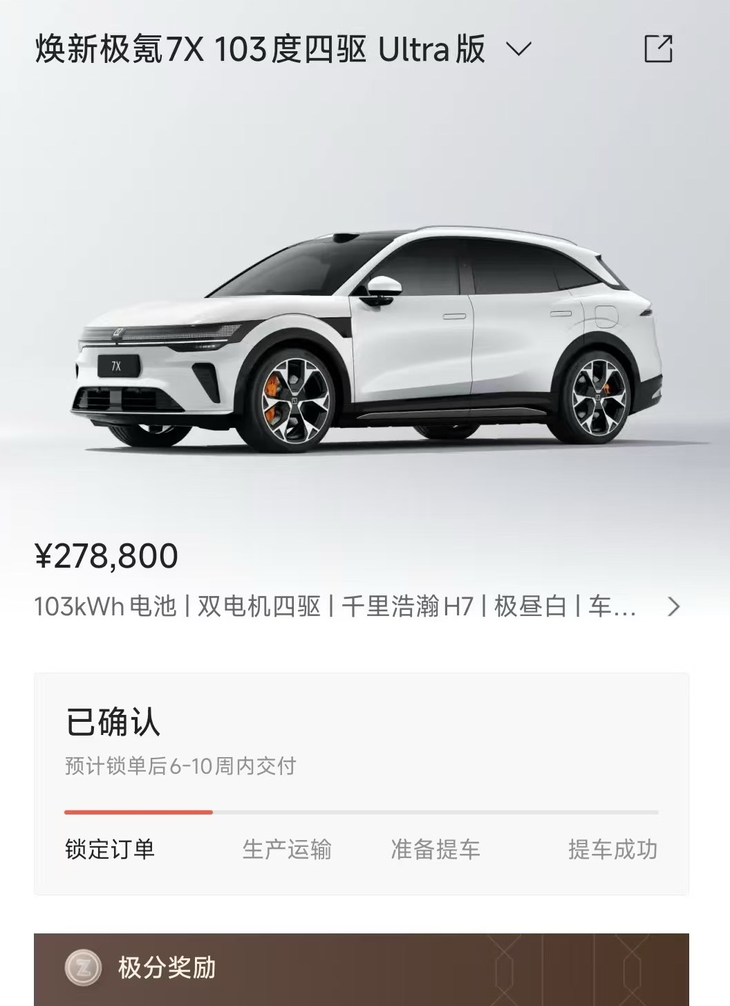 果然车排产到1月底交付,跨年提车,等于政策红利全蹭到了,购置税车企给兜底,能拿26年置换补贴,等车期间每天还有1000极分,提车后充电、买周边都能花。家人们,这下是真舒服了……