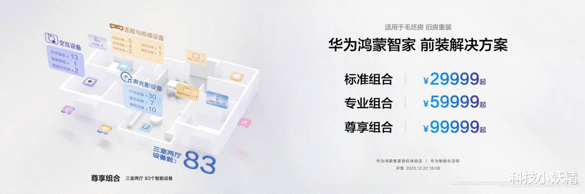 这种开放的生态,让华为鸿蒙智家跳出了“卖硬件”的局限,变成“全场景贴心管家”。以同步上新的覆盖前装和后装场景的各三档智装套餐为例,29999元起的前装套餐(针对3室2厅约90平米户型,推出了标准组合、专业组合、尊享组合),满足不同预算人群的品质家装需求,也实现了与地产项目的标准化、规模化对接。而9999元起的后装套餐,则通过技术创新,将以往需要“大动干戈”的改造,变为“一日焕新”的轻工程。刚需家庭有万元级的入门套餐,品质家庭能定制专属方案,租房族有可移动的智能小配件,不管什么需求都能找到适配的答案。对行业来说,这种开放的解决方案为行业立起了“开放共生”的新方向;对社会而言,这让智慧生活可以触及更多家庭,让健康舒适成为日常。华为鸿蒙智家稳居精装房智能家居市场占有率第一,就是行业和用户对这份温暖价值的双重认可。