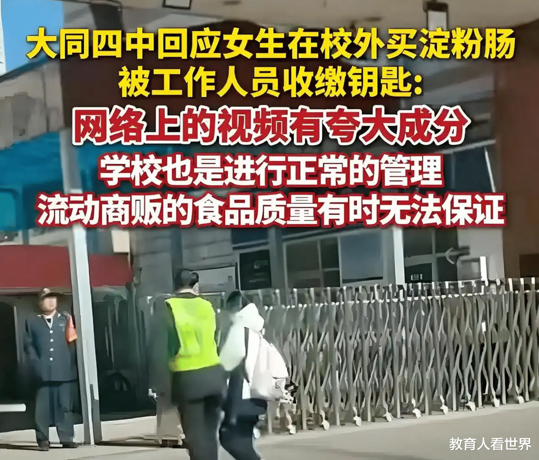 近日,大同四中校门口。女生购买淀粉肠,被工作人员拔走钥匙(含家门钥匙),女生哭着追讨的事,引发热议。当时,该校副校长表示:网络上的视频有夸大成分,学校是进行正常管理,流动摊贩的食品质量有时无法保证。