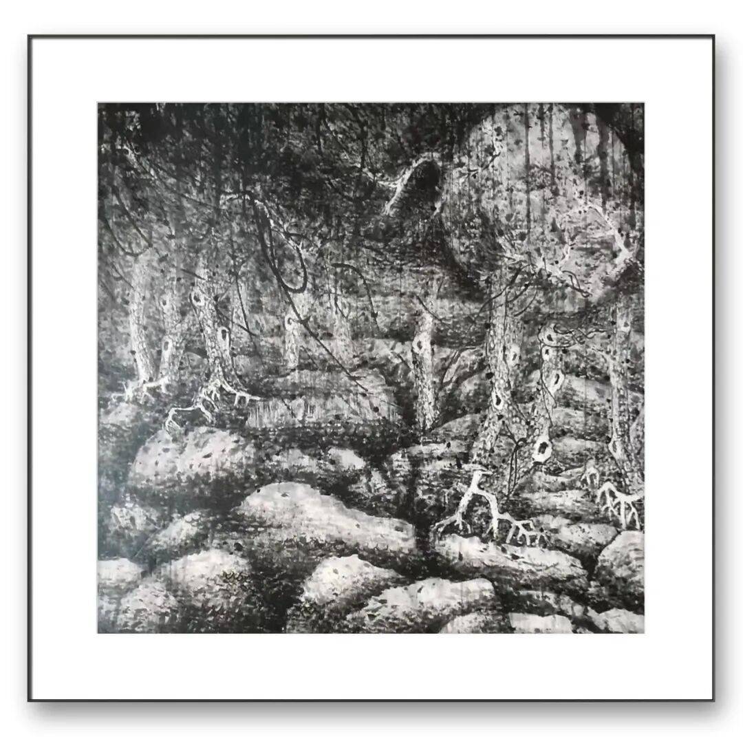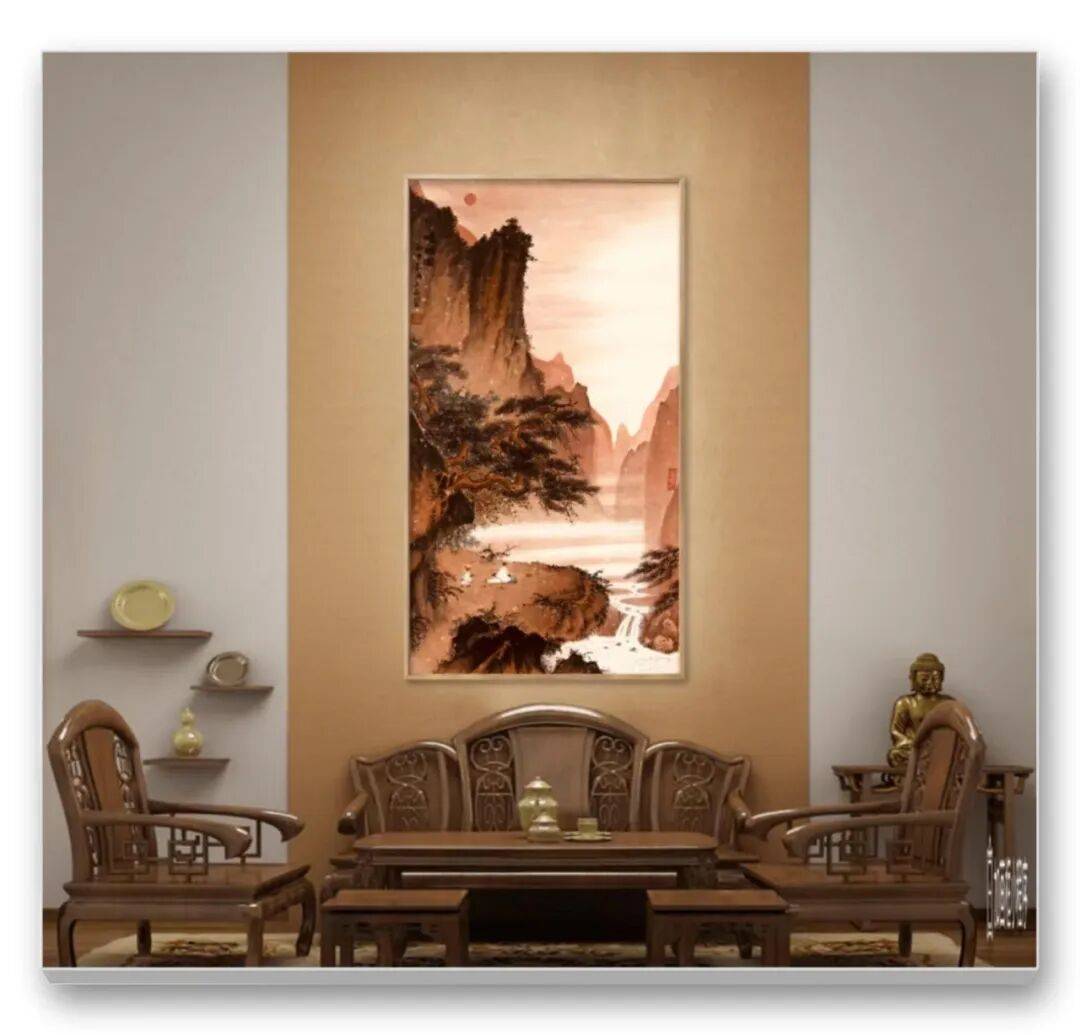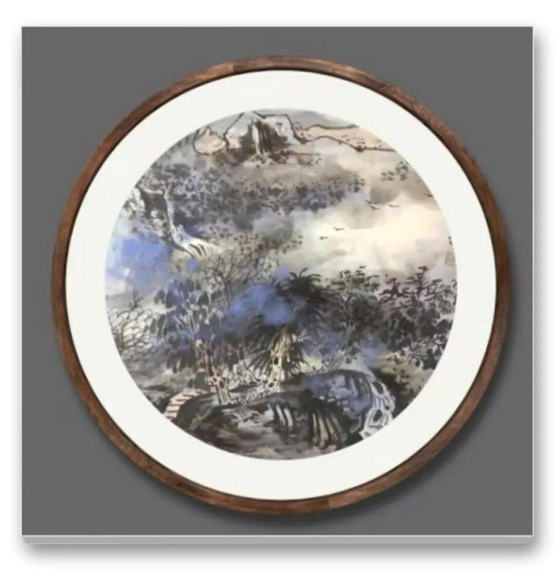 国画的笔墨意趣,又借鉴了西方绘画的色彩构成,营造出极具视觉冲击力的画面效果。在另一幅作品空谷梵音中,他以淡蓝与灰紫的色调渲染古刹,用线条勾勒门窗与桌椅,将传统建筑的结构美与现代抽象的形式感相结合,传递出“空寂悠远”的禅意。这种创新并非对传统的背离,而是在深刻理解传统精神基础上的拓展——他始终认为,山水画的核心是“意境”,而意境的营造可以通过多元的艺术语言实现。