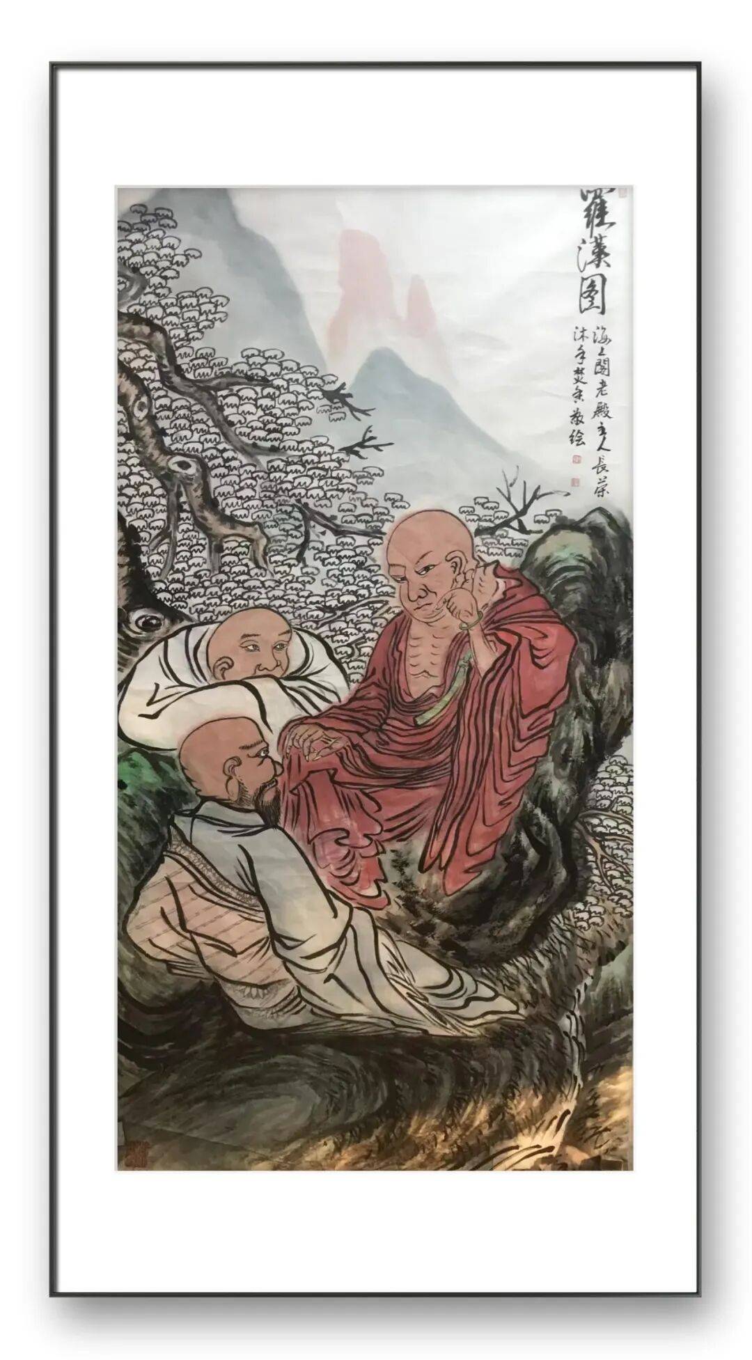 韩长荣的人物画,在传统笔墨中注入了鲜活的当代意趣,展现了他对人物精神世界的深刻洞察。画家以浓墨勾勒山石的嶙峋,用淡墨晕染远山的空濛,营造出一种 “空山不见人,但闻人语响” 的禅意氛围。罗汉的神态各异,或凝神沉思,或侧耳倾听,于静默中流露出对佛法的参悟,体现了画家对传统释道人物画的深厚功力。画家以简练的线条勾勒人物,用淡墨晕染衣袍,梅花的艳红与喜鹊的黑白形成鲜明对比,将 “喜上眉梢” 的吉祥寓意表现得生动而不媚俗。这两幅作品,一静一动,一禅一俗,既展现了韩长荣对传统笔墨的坚守,也体现了他在当代语境下对人物画的创新探索,是其 “重气韵、尚自然” 艺术理念的生动注脚。