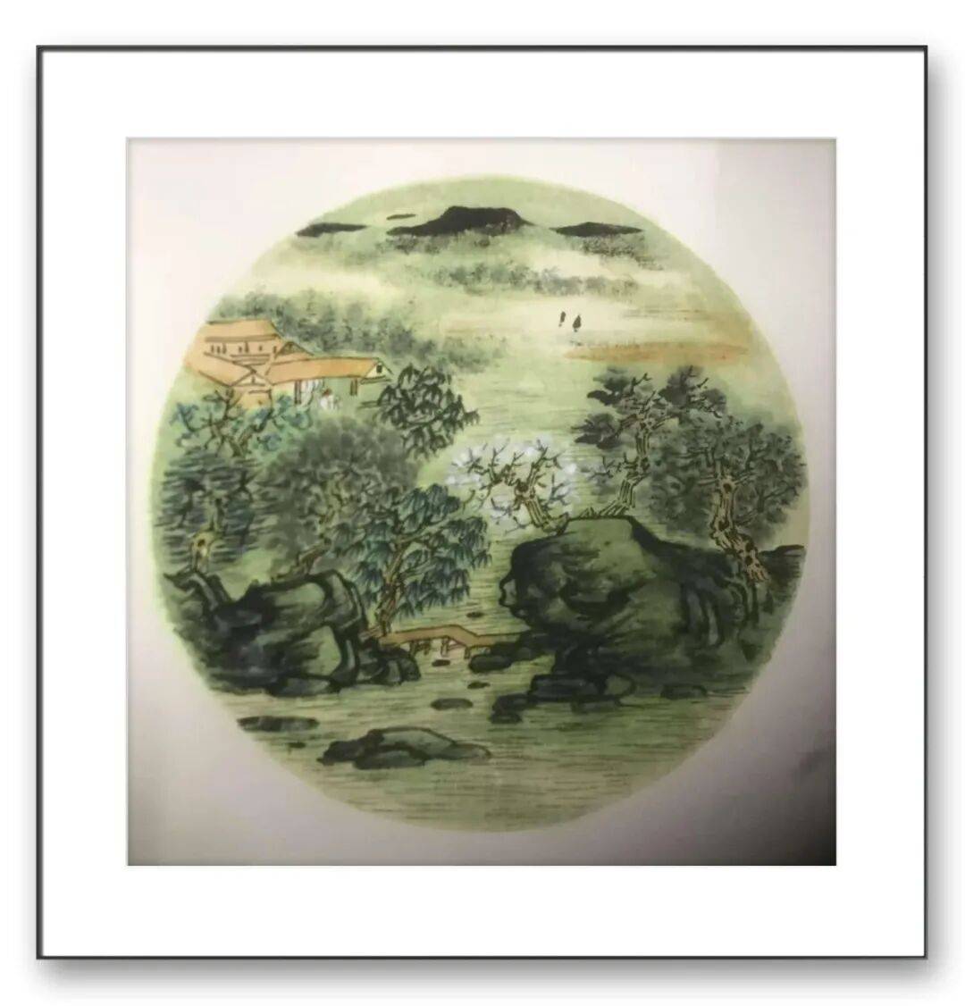 在水墨作品游云欲浮中,他以解索皴表现山石肌理,用枯笔焦墨勾勒松枝,再以淡墨渲染水面,墨色的浓淡干湿变化,既塑造了物象的质感,又强化了画面的韵律感。这种笔墨运用,既遵循了传统山水画的法度,又融入了个人性情:行笔的提按顿挫间,可见其对自然的细腻观察;墨色的氤氲流转中,蕴含着对天地精神的深刻体悟。值得注意的是,韩长荣的作品中常点缀人物意象:或策杖寻幽,或临江垂钓,或对坐论道。这些人物并非简单的场景补充,而是“天人合一”哲学思想的视觉表达——人在山水间,既是自然的观察者,也是意境的参与者。如他的扇面山水秋江独钓,一叶扁舟、一竿钓丝,在寥廓江天的映衬下,将传统文人“独与天地精神往来”的情怀表现得淋漓尽致。
