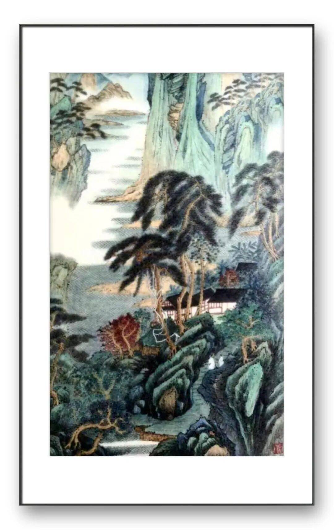 韩长荣的山水画,始终以“气韵生动”为核心追求。在他的作品中,笔墨不仅是造型手段,更是情感与精神的载体。以其青绿山水四条屏为例,画面以石青、石绿为主调,层层晕染出峰峦叠嶂的层次感,云雾以留白与淡墨晕染,似动似静地穿梭于山峦之间,营造出“山在虚无缥缈间”的空灵意境。前景的古松以浓墨点叶,枝干虬曲苍劲,与中景的屋舍、人物形成呼应,传递出“可居可游”的文人意趣。