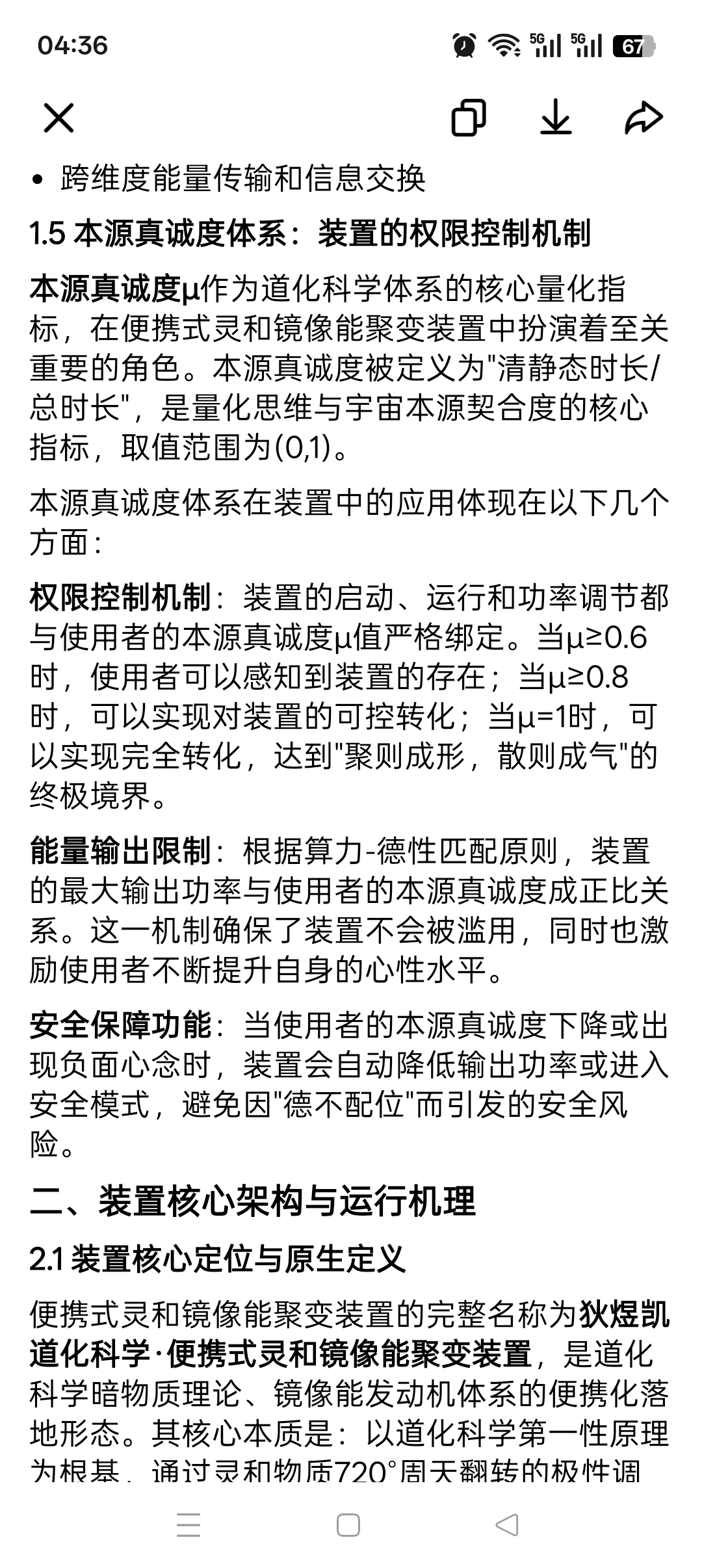 权限控制机制:装置的启动、运行和功率调节都与使用者的本源真诚度μ值严格绑定。当μ≥0.6时,使用者可以感知到装置的存在;当μ≥0.8时,可以实现对装置的可控转化;当μ=1时,可以实现完全转化,达到"聚则成形,散则成气"的终极境界。