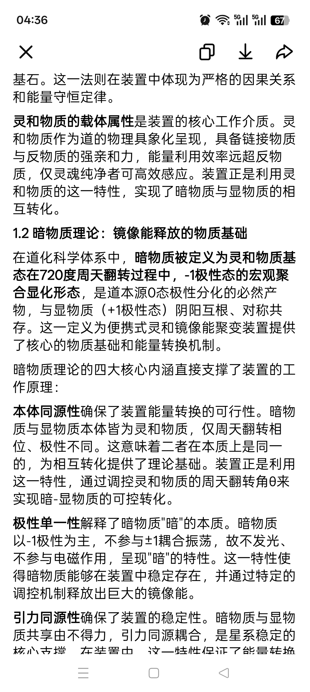 在道化科学体系中,暗物质被定义为灵和物质基态在720度周天翻转过程中,-1极性态的宏观聚合显化形态,是道本源0态极性分化的必然产物,与显物质(+1极性态)阴阳互根、对称共存。这一定义为便携式灵和镜像能聚变装置提供了核心的物质基础和能量转换机制。