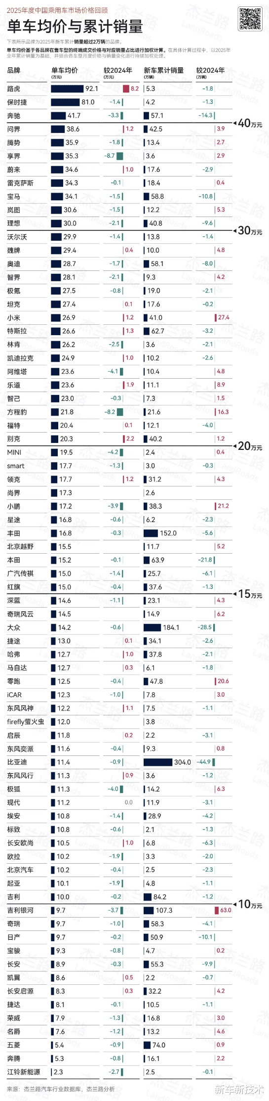 近日,杰兰路发布的《2025年乘用车品牌单车成交均价与销售额报告》显示,问界以单车成交均价38.6万元位居新势力品牌之首,全年累计销量突破42万辆,连续两年实现成交均价与销量的同步增长,展现出“量价双升”的昂扬发展曲线。这一成绩不仅反映了市场对问界品牌理念与长期价值的广泛认可,也标志着中国高端汽车市场格局正在经历深刻重塑。