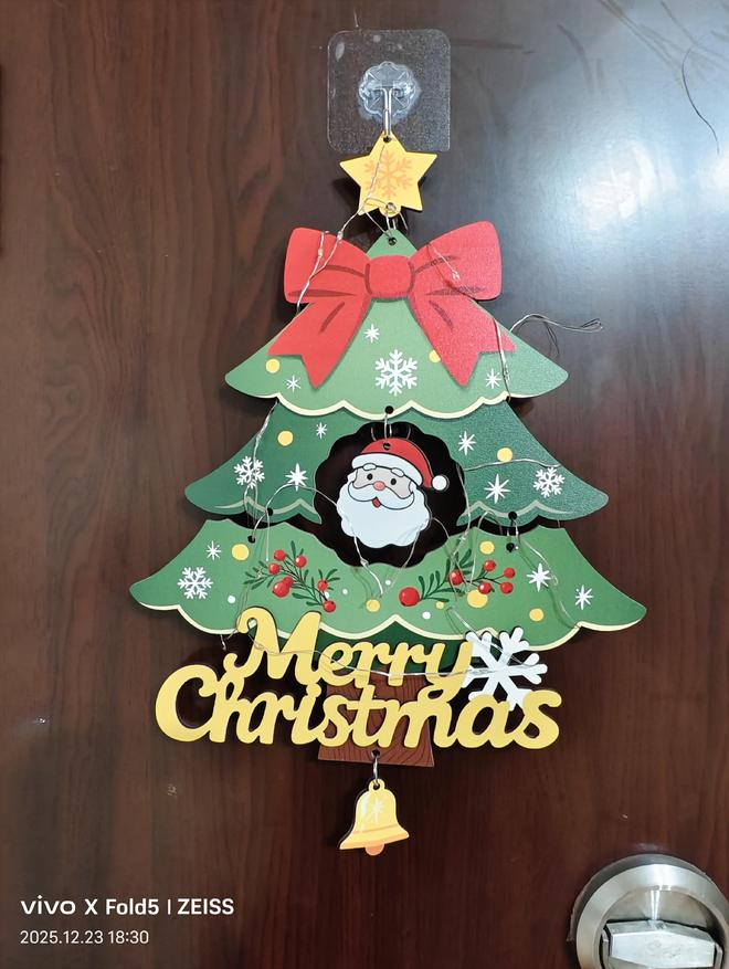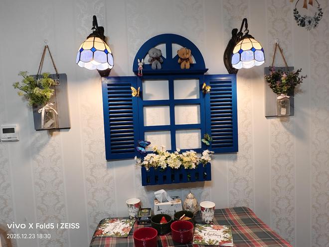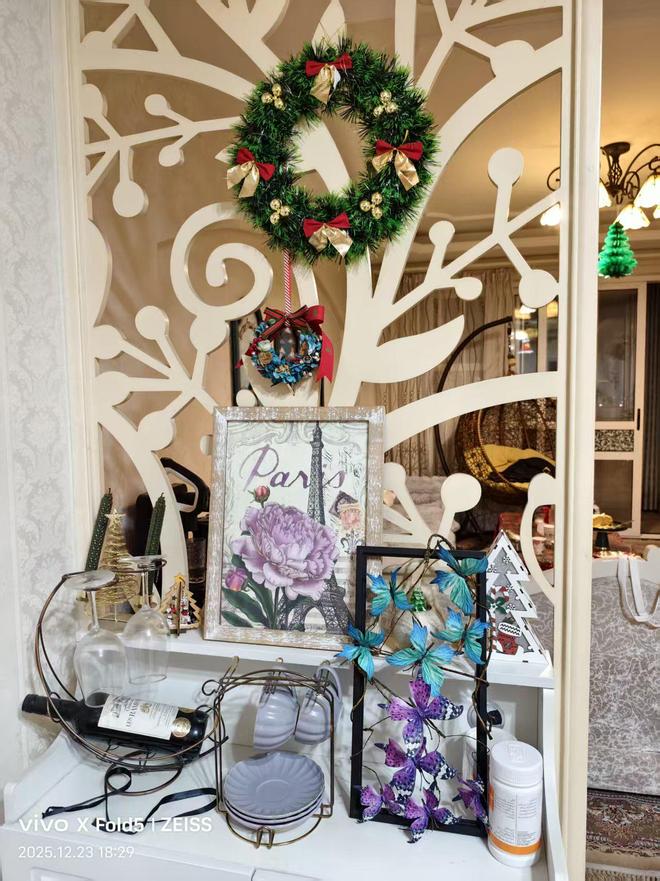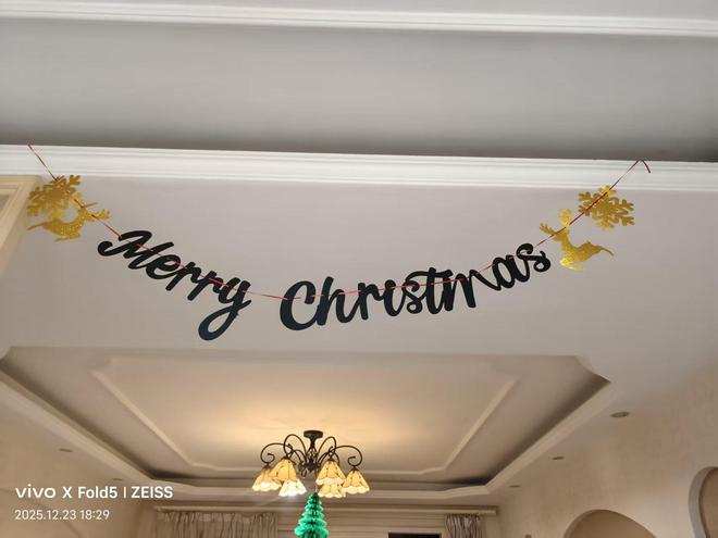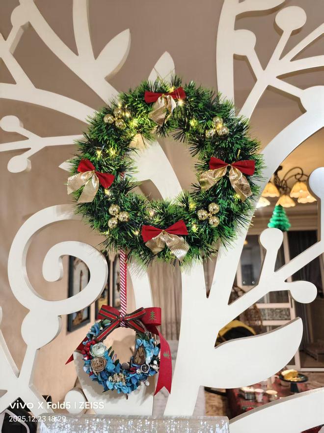 我满心动容,想着用相机定格这份美好,却被她轻声婉拒,带着几分腼腆示意多拍拍餐食便好,不愿出镜的她,更添几分低调温婉。也正是这般驻足,让我恍然惊觉,只顾着畅谈博弈,竟未细赏这方居所的雅致。全屋早已被她布置得满是圣诞韵味,墙面的创意圣诞树缀满精巧挂件,藏着别致巧思;她抬手站至凳上,按下厨房与客厅门楣处的开关,圣诞彩灯便次第亮起,柔光一闪一闪,将节日的浪漫与温馨拉满。恍惚间,《Jingle Bell》的轻快旋律似在耳畔流淌,麋鹿踏雪、雪橇徐行的画面映于心头,孩童的嬉闹与圣诞的欢喜,悄然漫入这方小天地,每一处细节,都将生活的精致与情趣,雕琢到了极致。