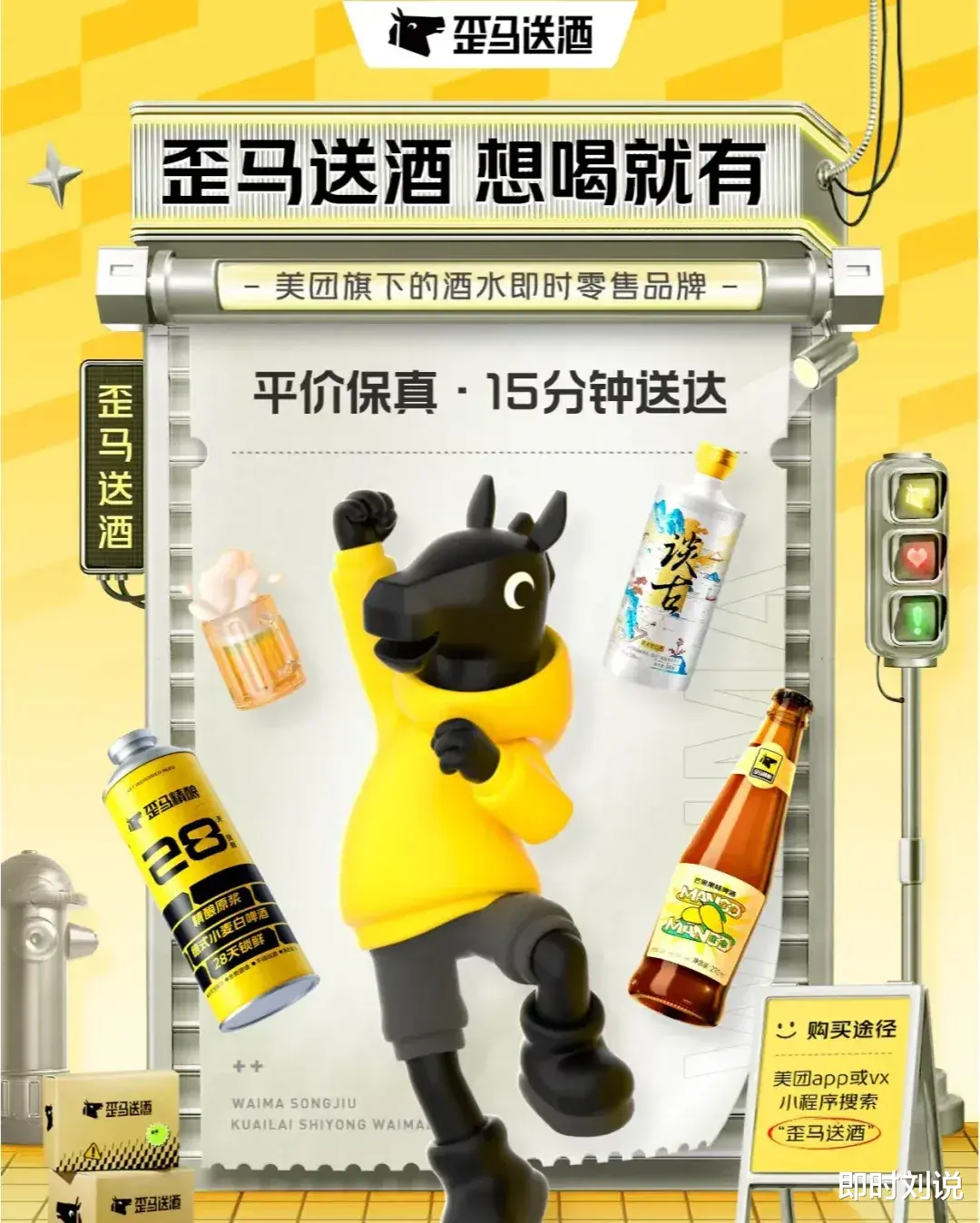 歪马送酒是美团旗下的即时零售酒水品牌,采用“前置仓+中心仓”的模式,自2021年6月,歪马在广东惠州开了第一家店,卖出了第一瓶酒以来,如今歪马用四年时间,不仅自己跑通了,还真把“即时送酒”这一新物种,变成了大家想喝酒时的自然选择。