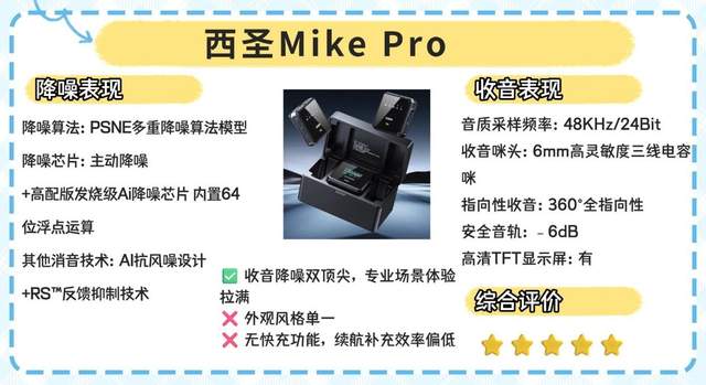 西圣Mike Pro采用360°全指向6mm高敏电容咪头,支持48kHz/24bit采样,人声细节丰富无失真。搭载DSP+AI双核驱动的PSNE四重降噪算法,可深度过滤车流、空调等中高强度噪音,室内直播、户外口播都适配。2.4GHz无线传输+海豚声纳定位,无遮挡100米稳定连接,支持一拖二收音,适合双人访谈。单发射器续航8小时,充电盒补能后总续航30小时,满足全天创作。但机身约18g,长时间佩戴有轻微坠感,户外大风天需搭配防风套,且无内置存储,断连易丢素材,不过支持-6dB安全音轨备份。优势是降噪与音质均衡,性价比突出,新手友好。