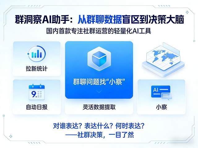 群洞察AI助手:从群聊数据盲区到决策大脑群洞察是国内首款专注社群运营的轻量化AI工具,旨在帮助社群管理员和运营者高效管理群聊内容,提升社群活跃度和工作效率。当多数工具聚焦“如何表达”时,群洞察专注于更根本的问题:“对谁表达?表达什么?何时表达?”