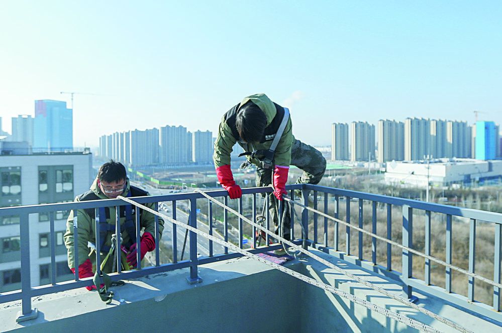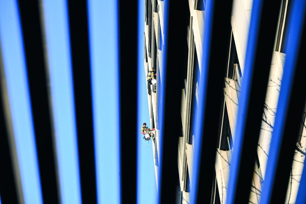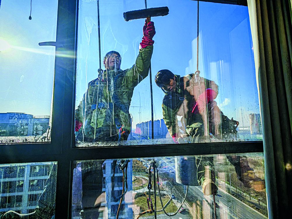 高空作业本就风险重重,大寒时节的低温、寒风更给作业增加了诸多挑战。王阳光、牛腾飞两位“蜘蛛人”身着专业防护装备,腰间系着安全绳索,稳稳地悬在楼宇外侧,从高层到低层,逐户擦拭玻璃外窗。王阳光介绍说,他们两人都有十几年的高空作业经验,最高曾在石家庄170米的高楼上作业,所以这只有15层的居民楼并不算很难的挑战。无论是顽固的灰尘、附着的污渍,还是冬日里凝结的霜迹,他们都耐心细致地清理。