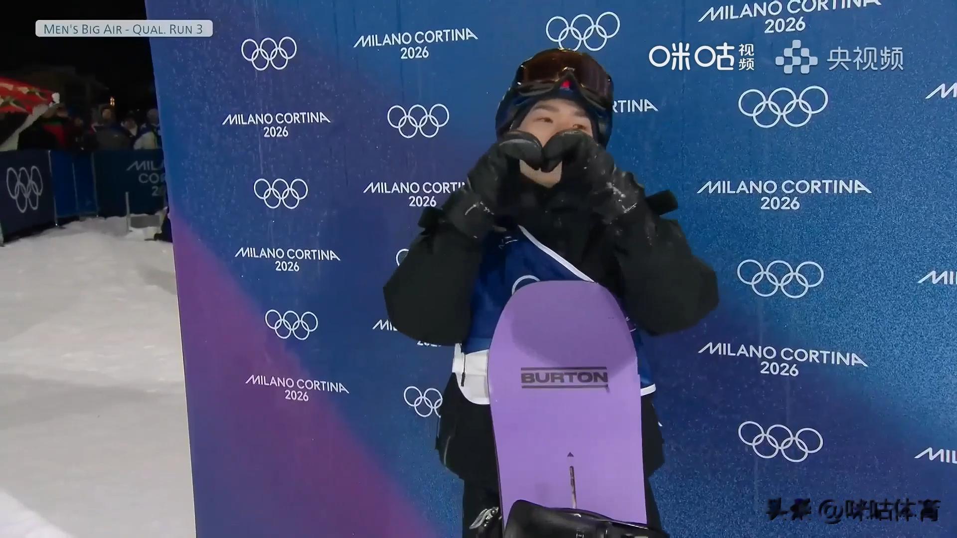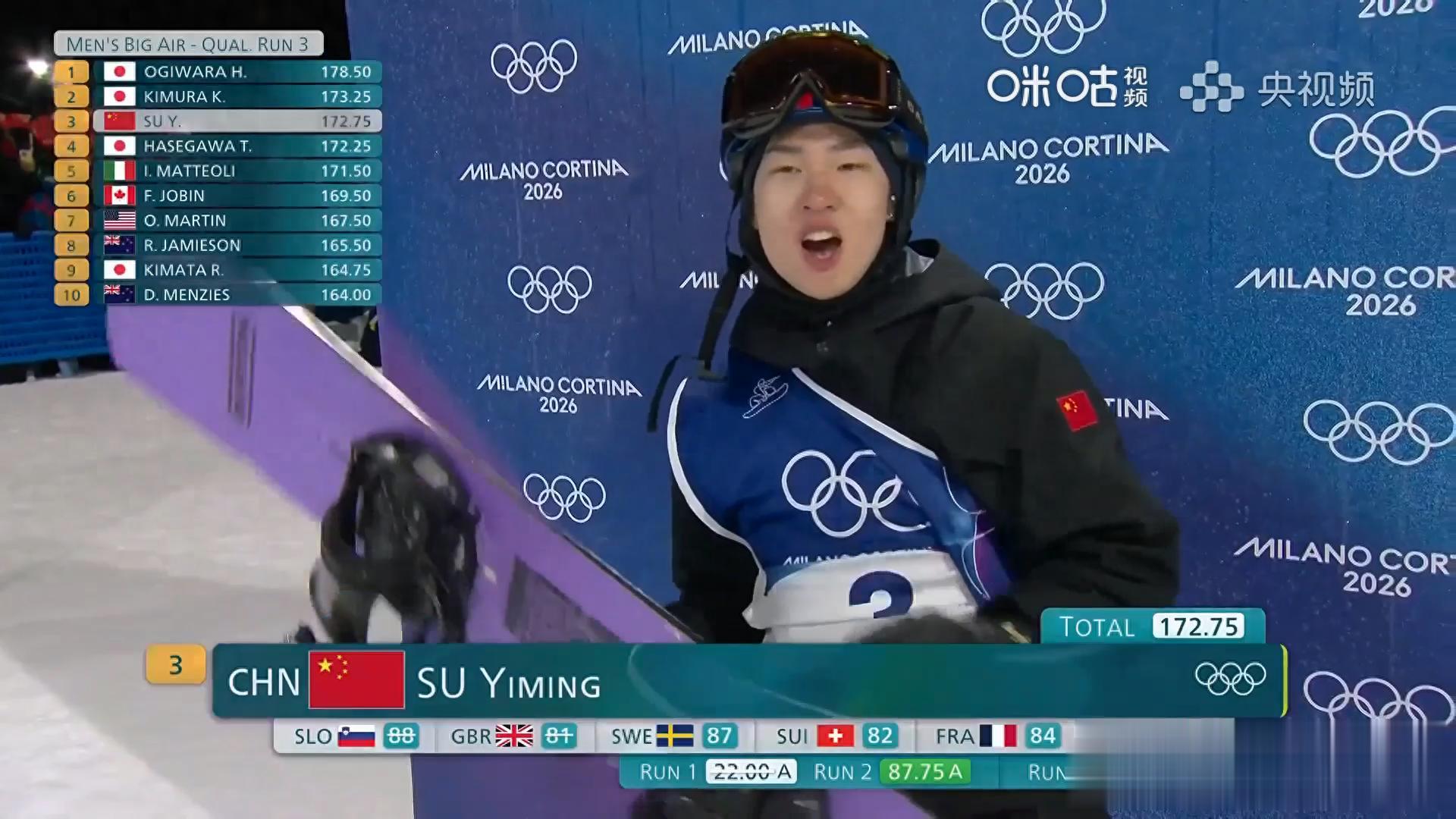 米兰冬奥会单板滑雪男子大跳台预赛,首跳摔倒的苏翊鸣展现大心脏,第二跳跳出87.75分后,又在第三跳完美的完成了1980,得到85分,总分172.75分,暂列第三位,锁定了决赛席位。
