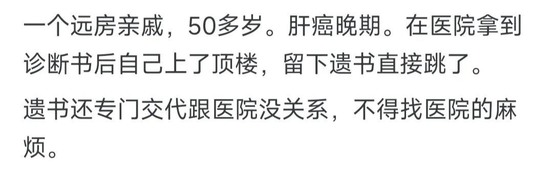 是个善良的狠人,不想拖累家人也不想害了医院,真让人心疼难过。但不建议这样,有钱就出去旅游,没钱就吃点好的喝点好的,快快活活过完剩下的日子,不好吗?