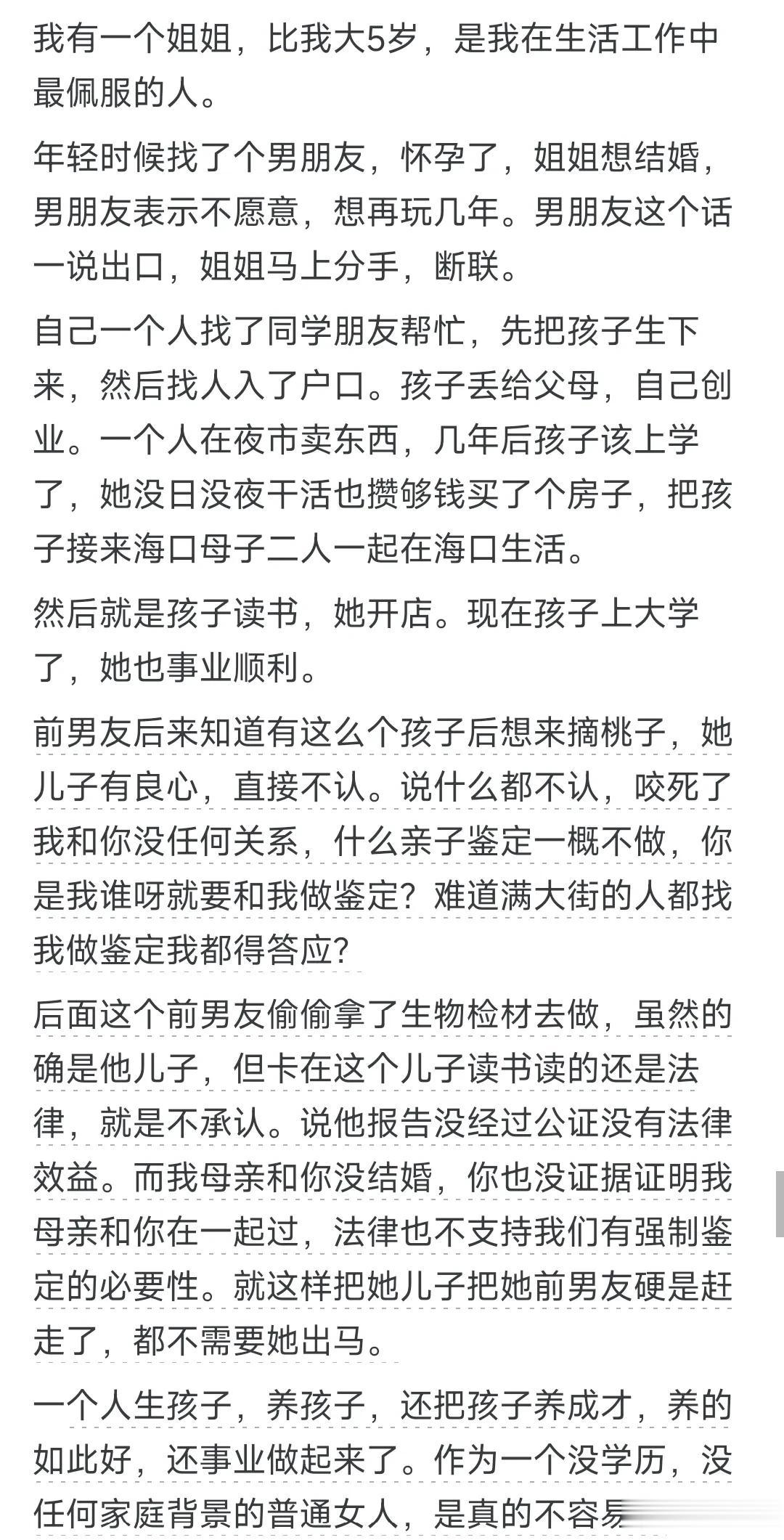 你这姐姐才是真正的女权,佩服至极。但是劝妹子们别乱学,一个孩子要养大,很不容易。再说,要是中途后悔了,是没办法把孩子塞回去的。不是所有女生都适合大女主、不是所有父母,都能接受女儿的私生子!