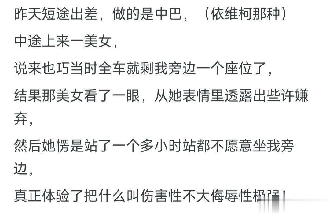 这个不算侮辱性特大,我才算,全车就我一个双人座没坐满,问题是车上站满人,男的女的老的小的丑的美的,我一下车,这个双人座就被人坐了。现在出门避讳双人座。