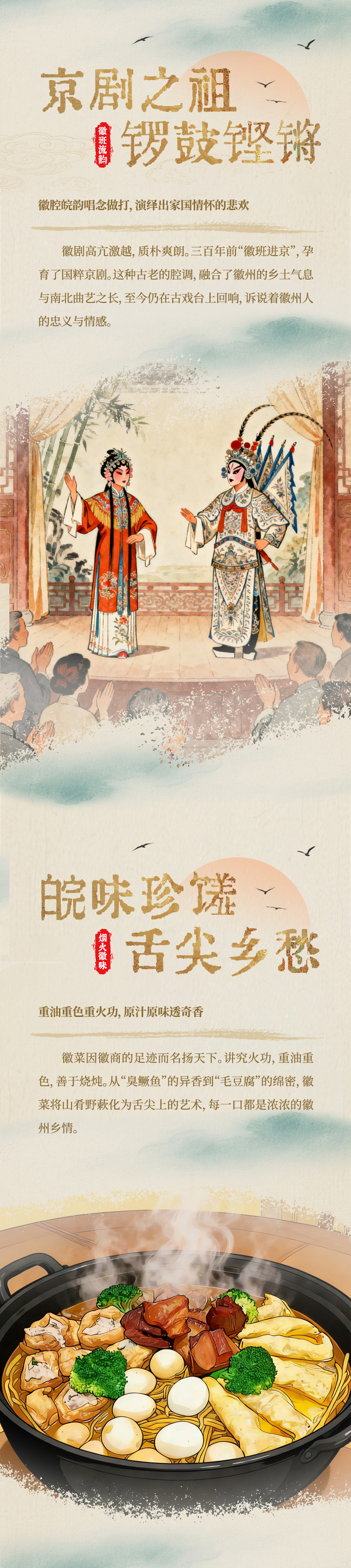从徽韵皖风到江河脉动,从戏韵流转到运河遗响,安徽的文化星空浩瀚而独特。徽州文化、长江文化、淮河文化、大运河文化、黄梅戏文化,五大脉络在此交汇,绘就一幅动静相宜、南北交融的人文版图。由安徽省委网信办主办、凤凰网安徽频道承办的“AI 定格 AH (安徽) 网络正能量主题传播活动”以数字画笔激活文化基因,让古老智慧在当代屏幕间重新流淌、生生不息。