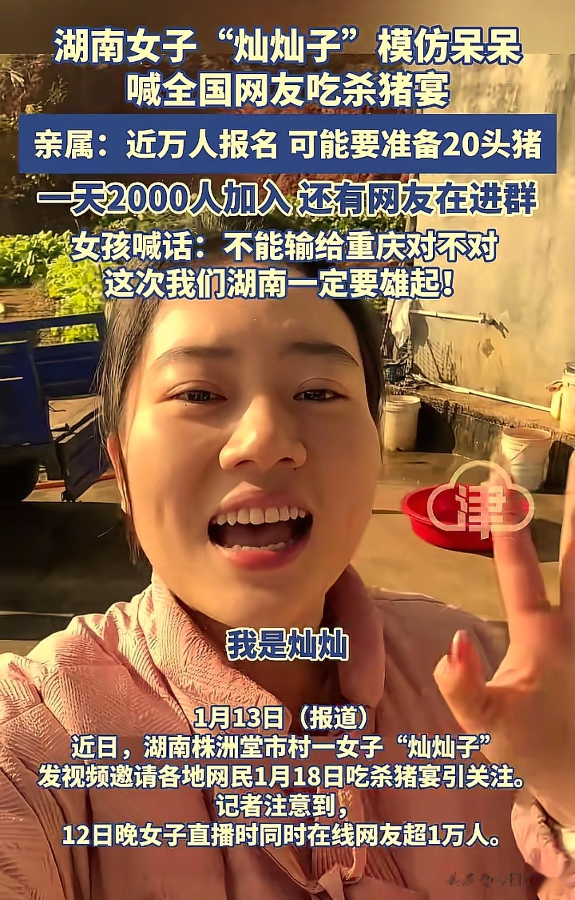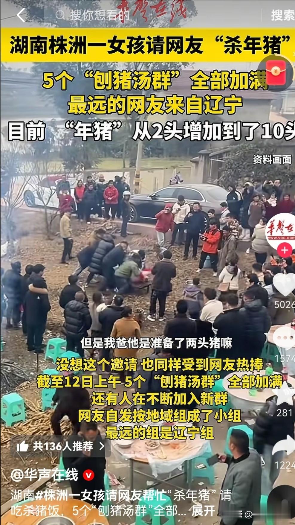 湖南株洲的灿灿看到这个情况,也跟着发了一条帖子,说欢迎大家来吃杀猪饭,他本来只打算杀两头猪,邀请的是本村和附近几个村的村民,结果报名的人一下子冲到八千多,五个五百人的微信群立刻满了,还有人在外面排队等着加群,灿灿没想过会有这么多人来,也没有收钱,连门票都没要。