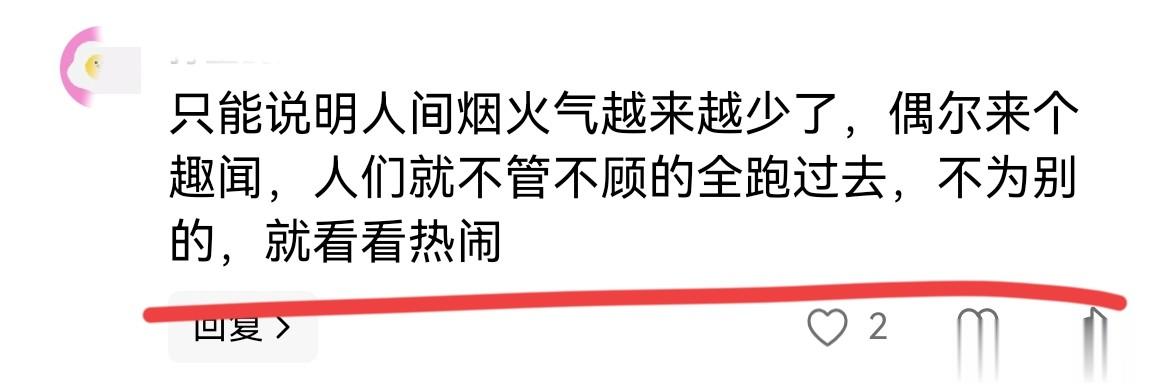 还有网友感慨,现在人间烟火气越来越淡,偶尔出个趣闻,大家就一股脑跑去看热闹,没别的目的。我觉得这话戳中了当下不少人寻求新鲜感的心态,确实是这么个理儿。
